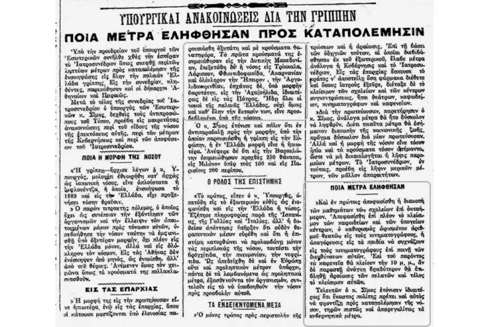 Το έτος 1918 «ταρακουνήθηκε» ο κόσμος από την πανδημία της ισπανικής γρίπης [1], με πολλούς θανάτους ανθρώπων. Υπολογίζονται από 17 έως 50 εκατομμύρια! Δε γλίτωσε ούτε η Ελλάδα, βέβαια, και φυσικά και η Λάρισα. Τα σχολεία της έκλεισαν, τουλάχιστον για έναν μήνα. Ονομάστηκε «Ισπανική» για τον εξής λόγο: Οι περισσότερες ευρωπαϊκές χώρες είχαν επιβάλλει λογοκρισία λόγω του Α’ Παγκοσμίου Πολέμου, με αποτέλεσμα να κρύβουν την έξαρση της πανδημίας. Αντίθετα, επειδή η Ισπανία είχε διατηρήσει στάση ουδετερότητας, ο Τύπος της έδινε μια πιο ρεαλιστική εικόνα της πανδημίας, με αποτέλεσμα να δώσει τότε την εντύπωση διεθνώς ότι η χώρα είχε πληγεί πολύ βαρύτερα από την ασθένεια. Γι’ αυτόν τον λόγο η νόσος έμεινε γνωστή ως ισπανική γρίπη.