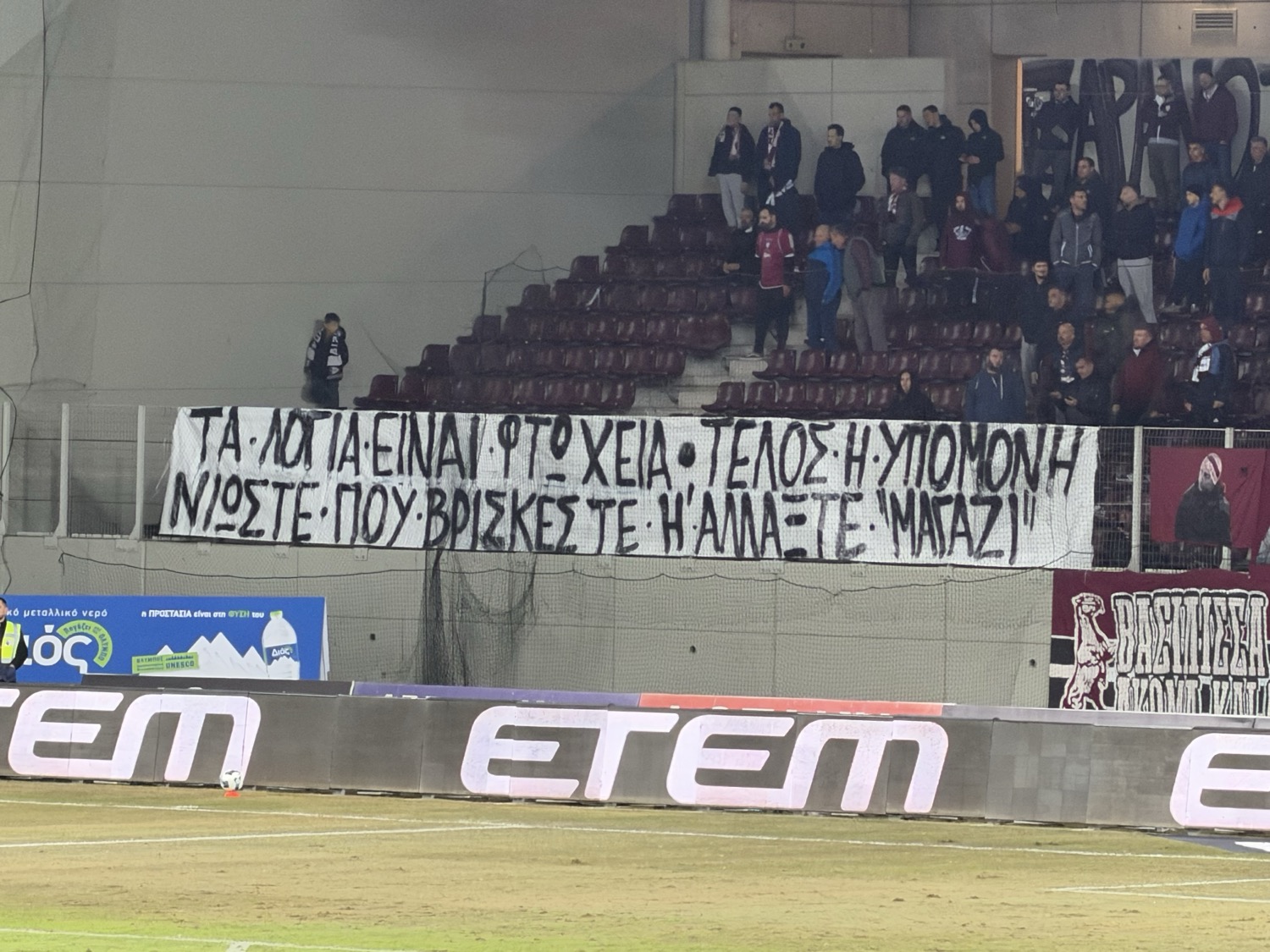 Οι οργανωμένοι στο πέταλο, ανάρτησαν πανό πριν από την έναρξη του αγώνα το οποίο έγραφε «ΤΑ ΛΟΓΙΑ ΕΙΝΑΙ ΦΤΩΧΕΙΑ. ΤΕΛΟΣ Η ΥΠΟΜΟΝΗ. ΝΙΩΣΤΕ ΠΟΥ ΒΡΙΣΚΕΣΤΕ Η ΑΛΛΑΞΤΕ ΜΑΓΑΖΙ».