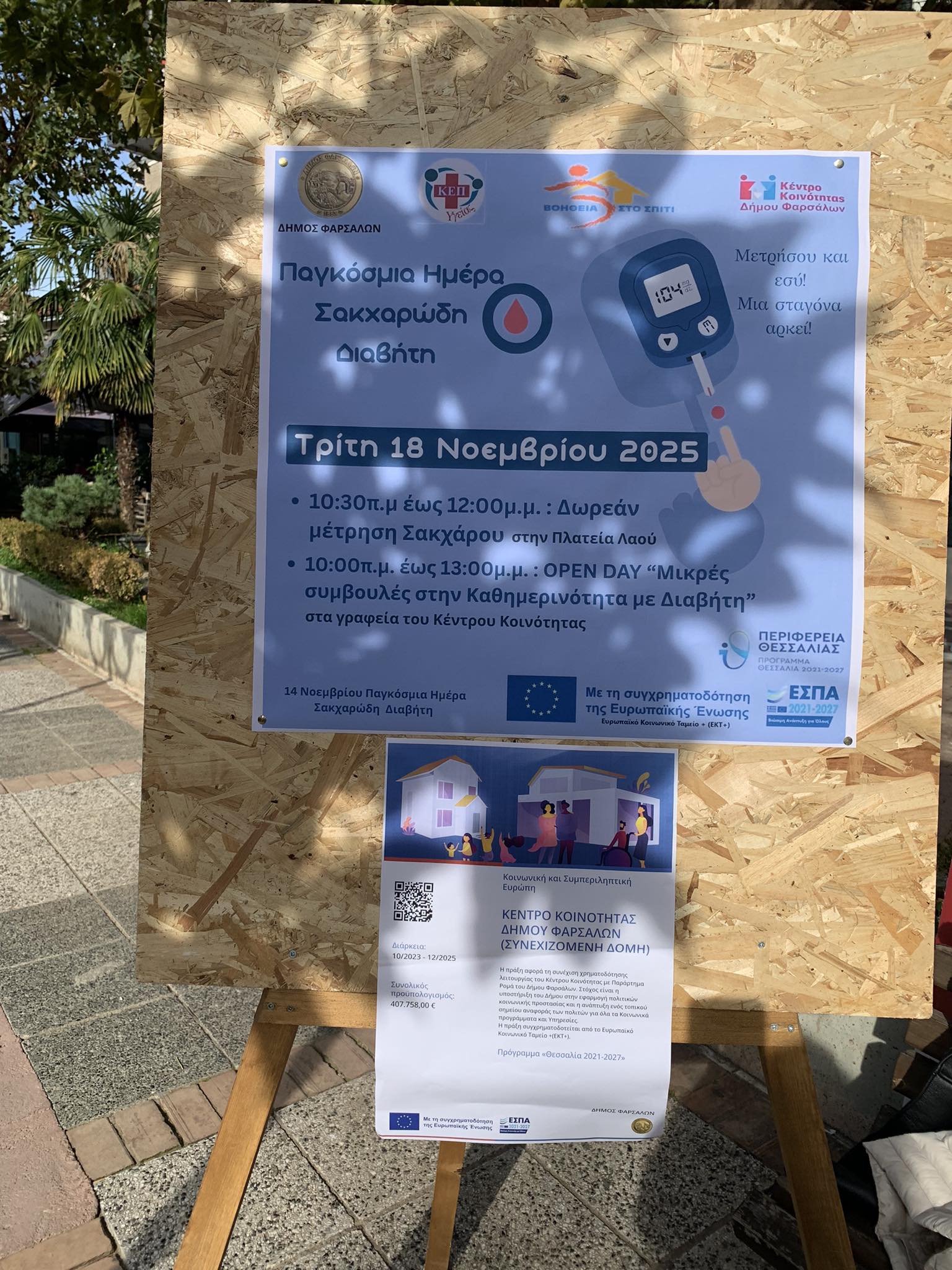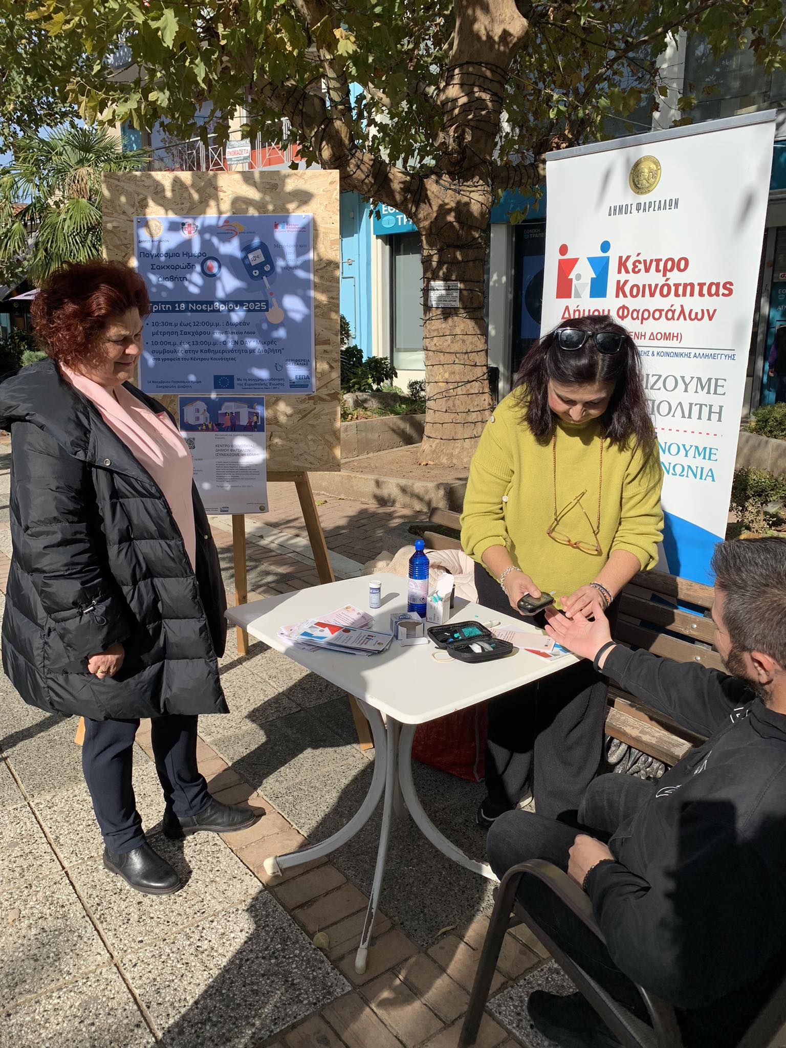 Με επιτυχία πραγματοποιήθηκε την Τρίτη 18 Νοεμβρίου 2025 η Δράση πρόληψης, ενημέρωσης και ευαισθητοποίησης για τον Σακχαρώδη Διαβήτη που διοργάνωσε το Κέντρο Κοινότητας του Δήμου Φαρσάλων σε συνεργασία με το Βοήθεια στο σπίτι και το ΚΕΠ Υγείας Δήμου Φαρσάλων.