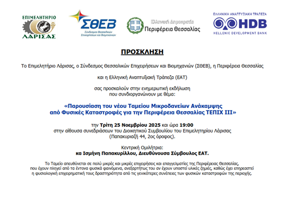 Το Επιμελητήριο Λάρισας, ο Σύνδεσμος Θεσσαλικών Επιχειρήσεων και Βιομηχανιών(ΣΘΕΒ), η Περιφέρεια Θεσσαλίας και η Ελληνική Αναπτυξιακή Τράπεζα (ΕΑΤ) διοργανώνουν ενημερωτική εκδήλωση με θέμα: ”Παρουσίαση του νέου Ταμείου Μικροδανείων Ανάκαμψης από Φυσικές Καταστροφές για την Περιφέρεια Θεσσαλίας ΤΕΠΙΧ ΙΙΙ” που θα πραγματοποιηθεί σήμερα Τρίτη 25 Νοεμβρίου και ώρα 19:00 στην αίθουσα συνεδριάσεων του Διοικητικού Συμβουλίου του Επιμελητηρίου Λάρισας (Παπακυριαζή 44, 2ος όροφος).
