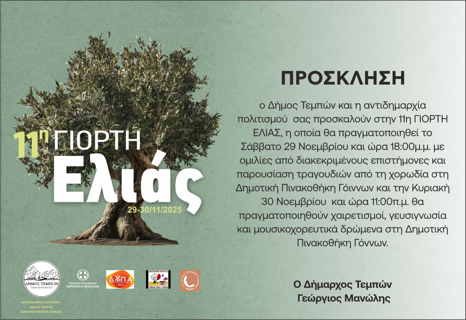 Για 11η χρονιά, ο Δήμος Τεμπών τιμά την παράδοση και τον πρωταγωνιστή της τοπικής αγροτικής παραγωγής: την ελιά. Η καθιερωμένη «Πανδημοτική Γιορτή Ελιάς» θα πραγματοποιηθεί στους Γόννους, ένα από τα σημαντικότερα ελαιοπαραγωγικά χωριά της περιοχής, το Σάββατο 29 και την Κυριακή 30 Νοεμβρίου, στη Δημοτική Πινακοθήκη Γόννων.