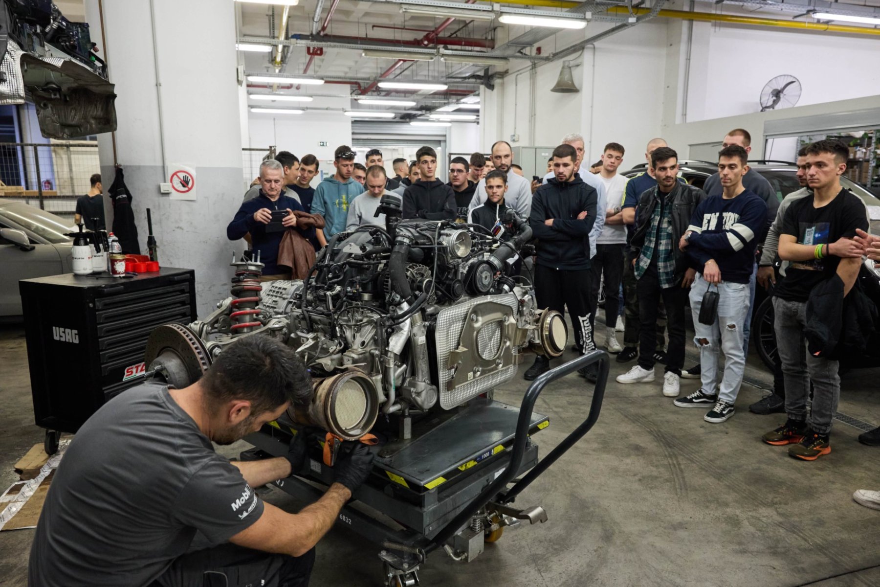 Στην εκδήλωση συμμετείχαν επίσης σπουδαστές της ΕΠΑΣ Λάρισας της ΔΥΠΑ, οι οποίοι ταξίδεψαν στην Αθήνα συνοδευόμενοι από τους εκπαιδευτικούς τους. Τους υποδέχθηκε ο Βαγγέλης Πλυτάς, Business Development Manager της Porsche, ο οποίος παρουσίασε την ιστορία και την τεχνολογική εξέλιξη της μάρκας. Ακολούθησε ξενάγηση στις υπερσύγχρονες εγκαταστάσεις service και φανοποιείου, καθώς και παρουσίαση της ηλεκτρικής Porsche Taycan και των τεχνολογιών που διαμορφώνουν το μέλλον της αυτοκίνησης.