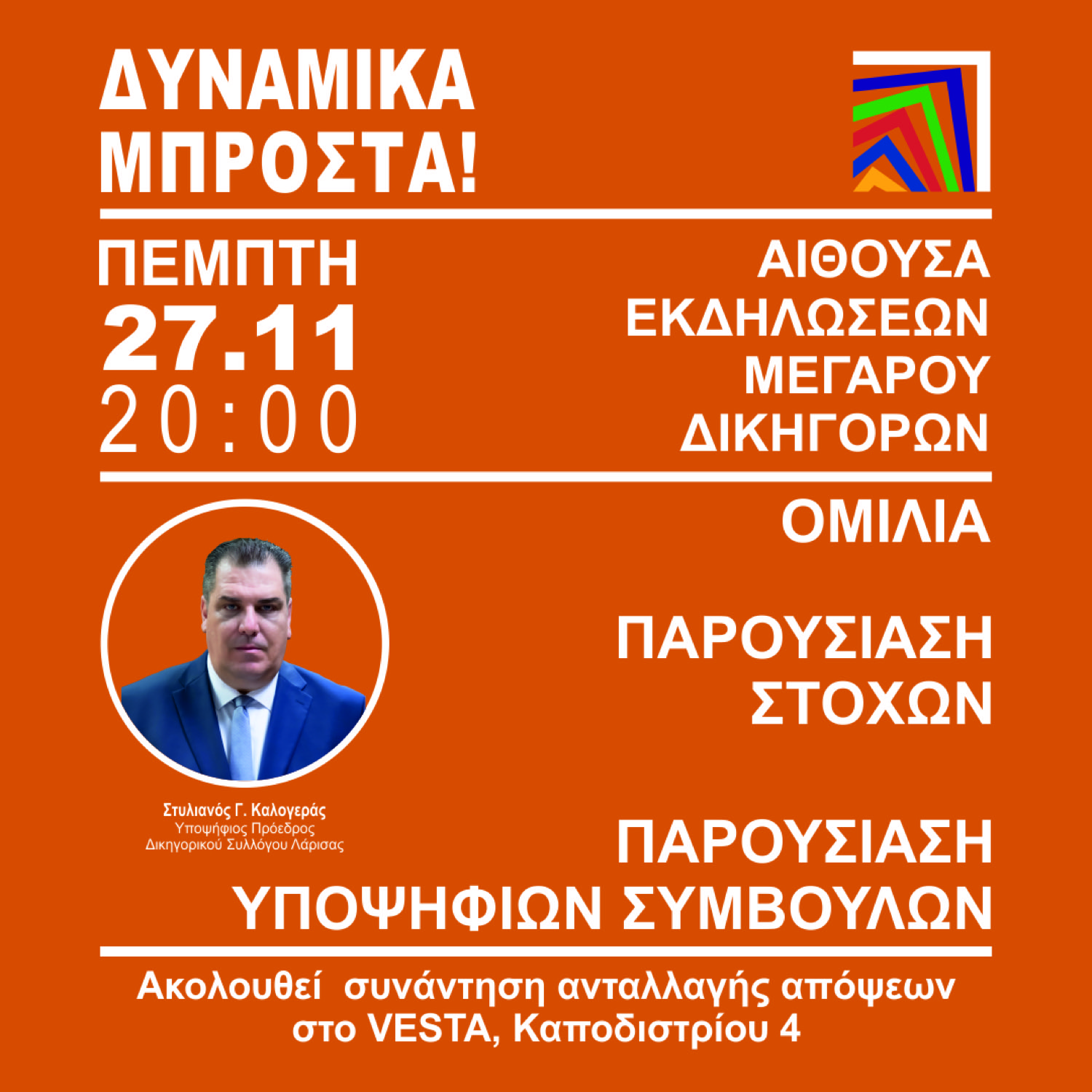 Ομιλία, παρουσίαση στόχων και παρουσίαση υποψηφίων συμβούλων του Στέλιου Καλογερά θα λάβει χώρα, μεθαύριο Πέμπτη (27/11), ώρα 8 μ.μ. στην αίθουσα εκδηλώσεων του μεγάρου δικηγόρων Λάρισας. Αμέσως μετά θα γίνει συνάντηση ανταλλαγής απόψεων στο μπαρ VESTA.