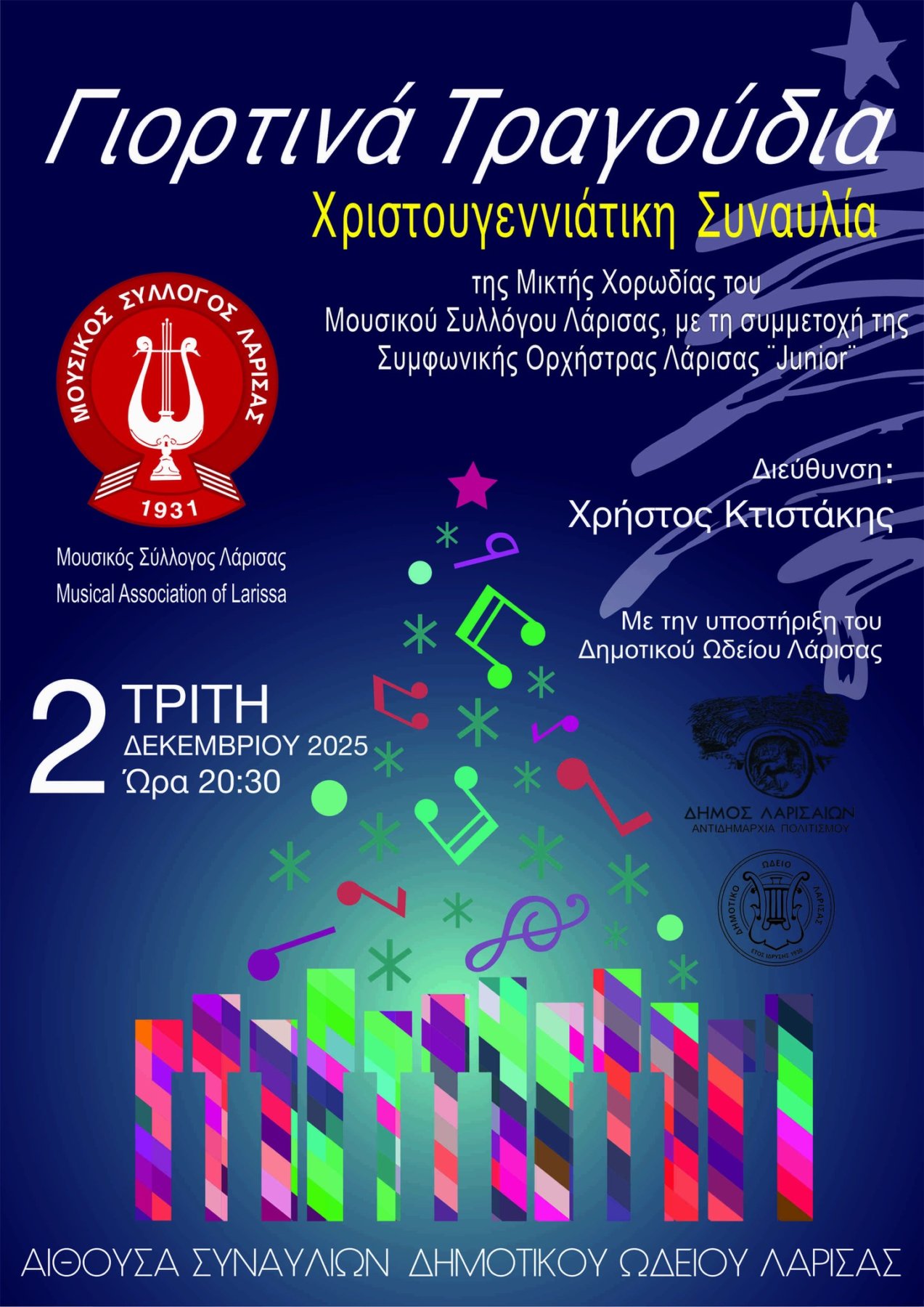 Η Μικτή Χορωδία του Μουσικού Συλλόγου Λάρισας προσκαλεί το κοινό σε μια μοναδική μουσική βραδιά που θα σημάνει επίσημα την έναρξη της πιο μαγικής εποχής του χρόνου. Την Τρίτη 2 Δεκεμβρίου 2025, στις 20:30, η αίθουσα του Δημοτικού Ωδείου Λάρισας θα πλημμυρίσει με μελωδίες, φως και χριστουγεννιάτικη θαλπωρή, στη μεγάλη συναυλία με τίτλο «Γιορτινά τραγούδια», μια λαμπερή συνάντηση χορωδίας και ορχήστρας.