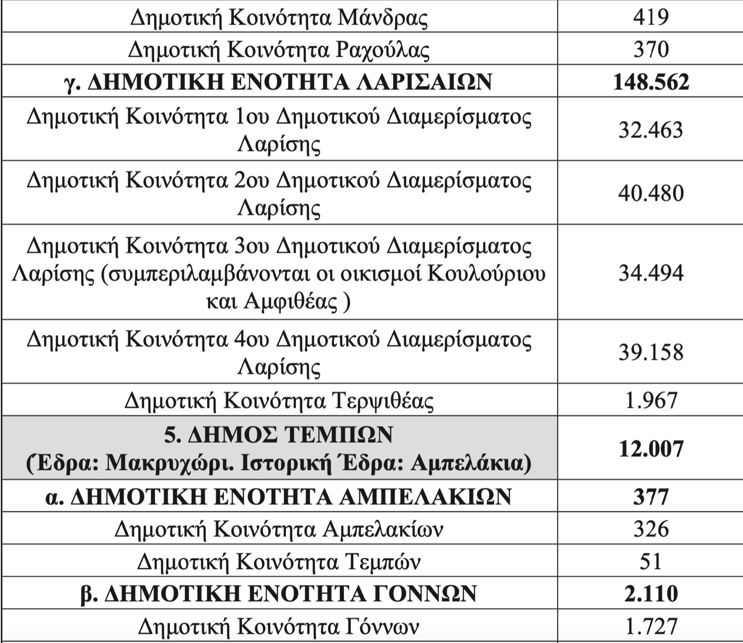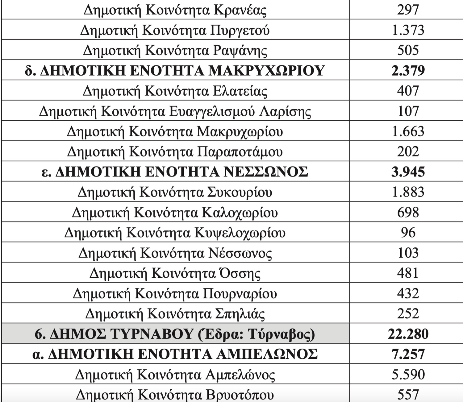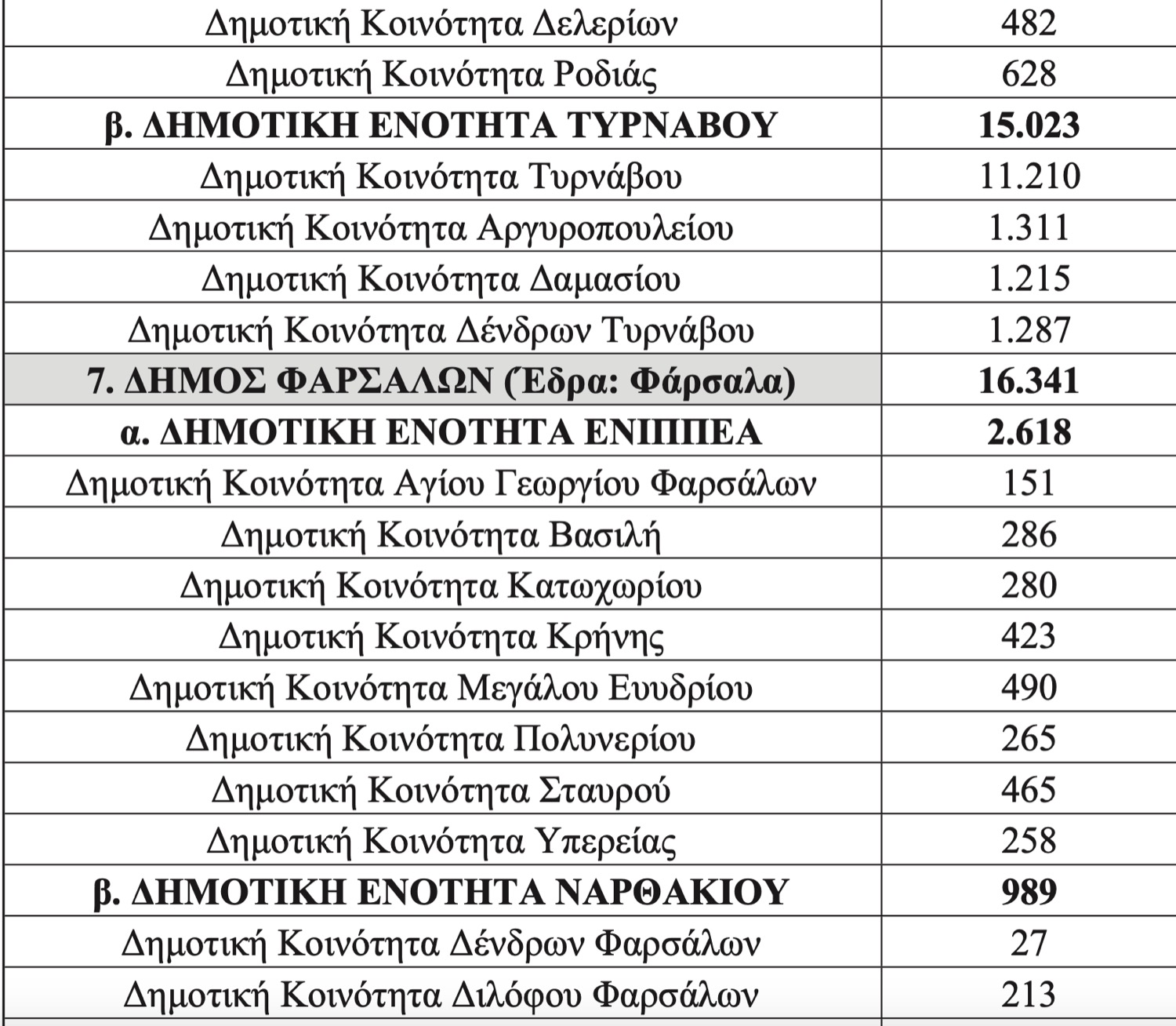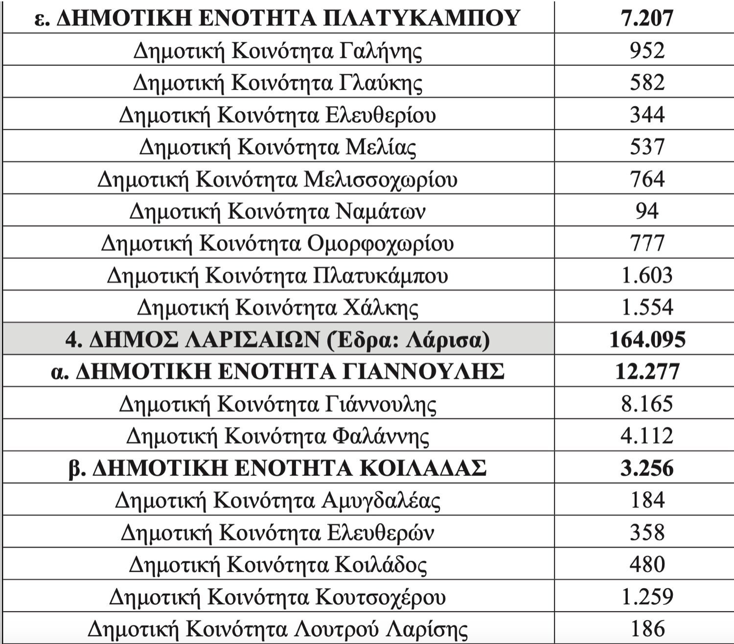 Αυτή είναι η αναλυτική καταγραφή των Δήμων και Κοινοτήτων της Λάρισας με βάση την τελευταία απογραφή πληθυσμού – Όλα τα στοιχεία