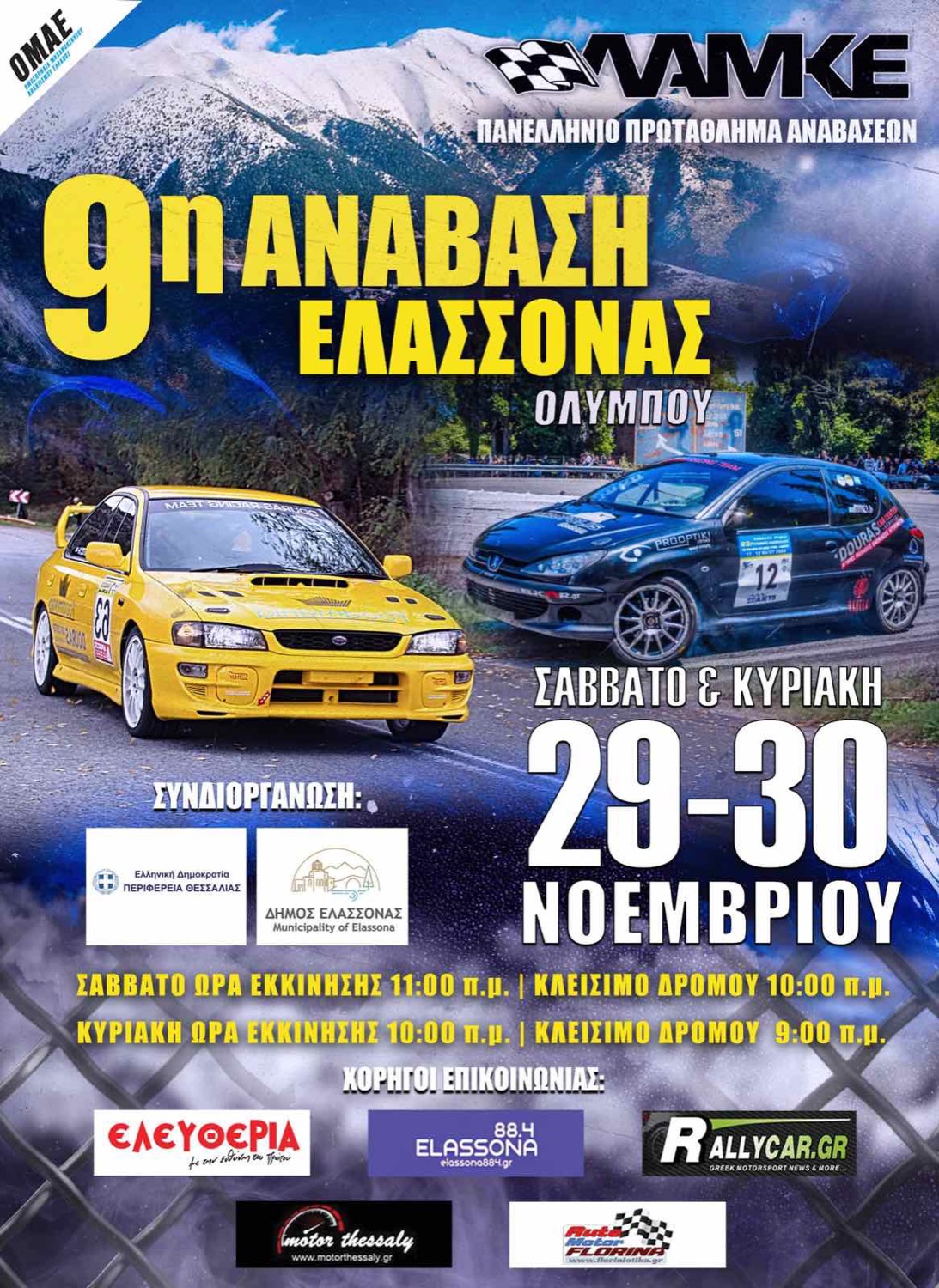 Όλα είναι έτοιμα για τη διεξαγωγή της 9ης Ανάβασης Ελασσόνας, η οποία φέτος αποτελεί και τον τελικό αγώνα του Πανελλήνιου Πρωταθλήματος Αναβάσεων, όπου θα κριθούν οι φετινοί πρωταθλητές. Η διοργάνωση θα πραγματοποιηθεί το Σαββατοκύριακο 29–30 Νοεμβρίου, με συνδιοργανωτή τον Δήμο Ελασσόνας, προσφέροντας στους φίλους του μηχανοκίνητου αθλητισμού ένα εντυπωσιακό αγωνιστικό θέαμα.