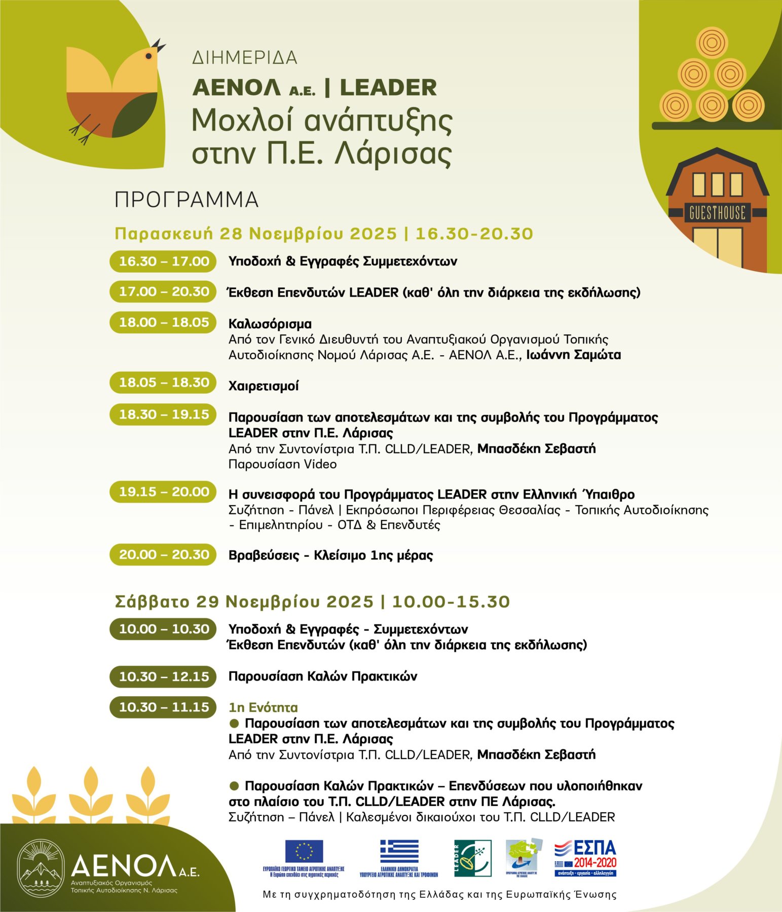 Ο Αναπτυξιακός Οργανισμός Τοπικής Αυτοδιοίκησης Νομού Λάρισας Α.Ε. – ΑΕΝΟΛ Α.Ε., με αφορμή την ολοκλήρωση του προγράμματος CLLD/LEADER του Προγράμματος «Αγροτική Ανάπτυξη της Ελλάδας 2014-2020» (ΠΑΑ), διοργανώνει επετειακή εκδήλωση με τίτλο «ΑΕΝΟΛ και LEADER: Μοχλοί Ανάπτυξης στην Π.Ε. Λάρισας», στο πλαίσιο εμψύχωσης του τοπικού πληθυσμού και των ενεργειών προβολής του τοπικού προγράμματος CLLD/LEADER και την παρουσίαση των αποτελεσμάτων του.