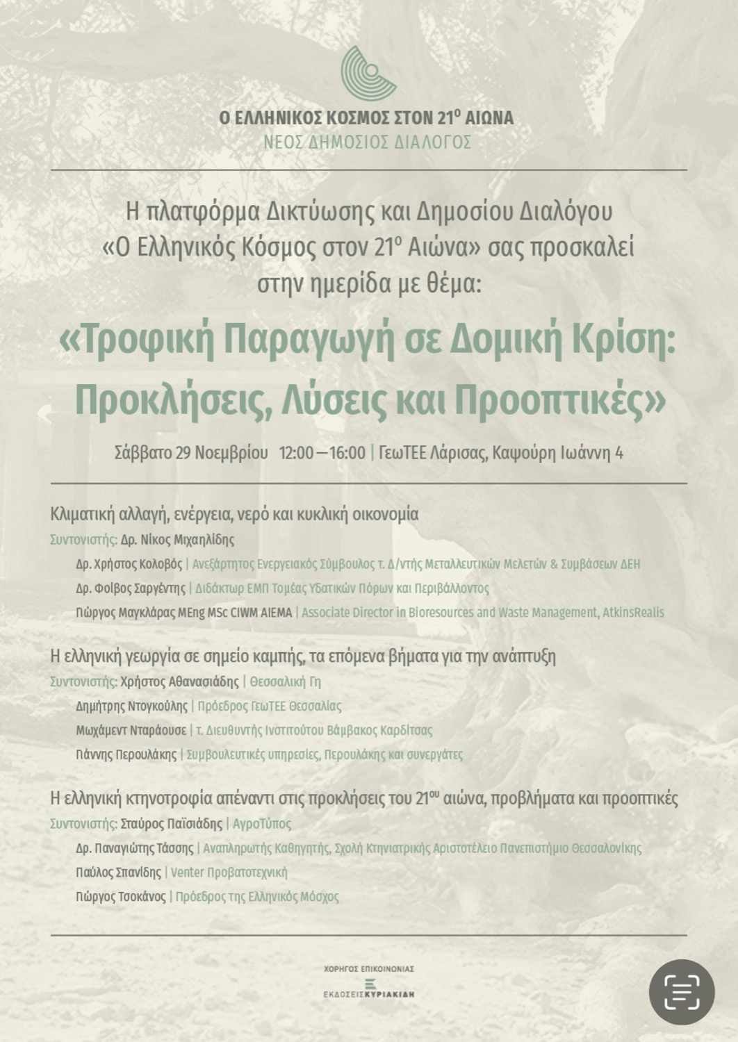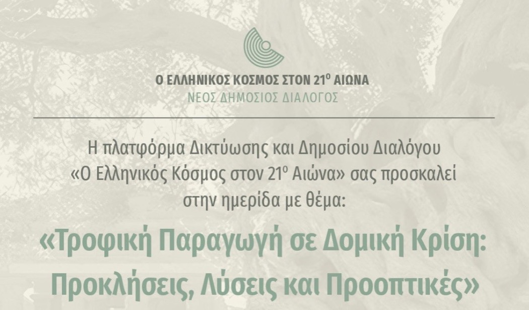 Ο Ελληνικός Κόσμος στον 21ο Αιώνα ανακοινώνει την ημερίδα «Τροφική παραγωγή σε δομική κρίση: Προκλήσεις, λύσεις και προοπτικές».