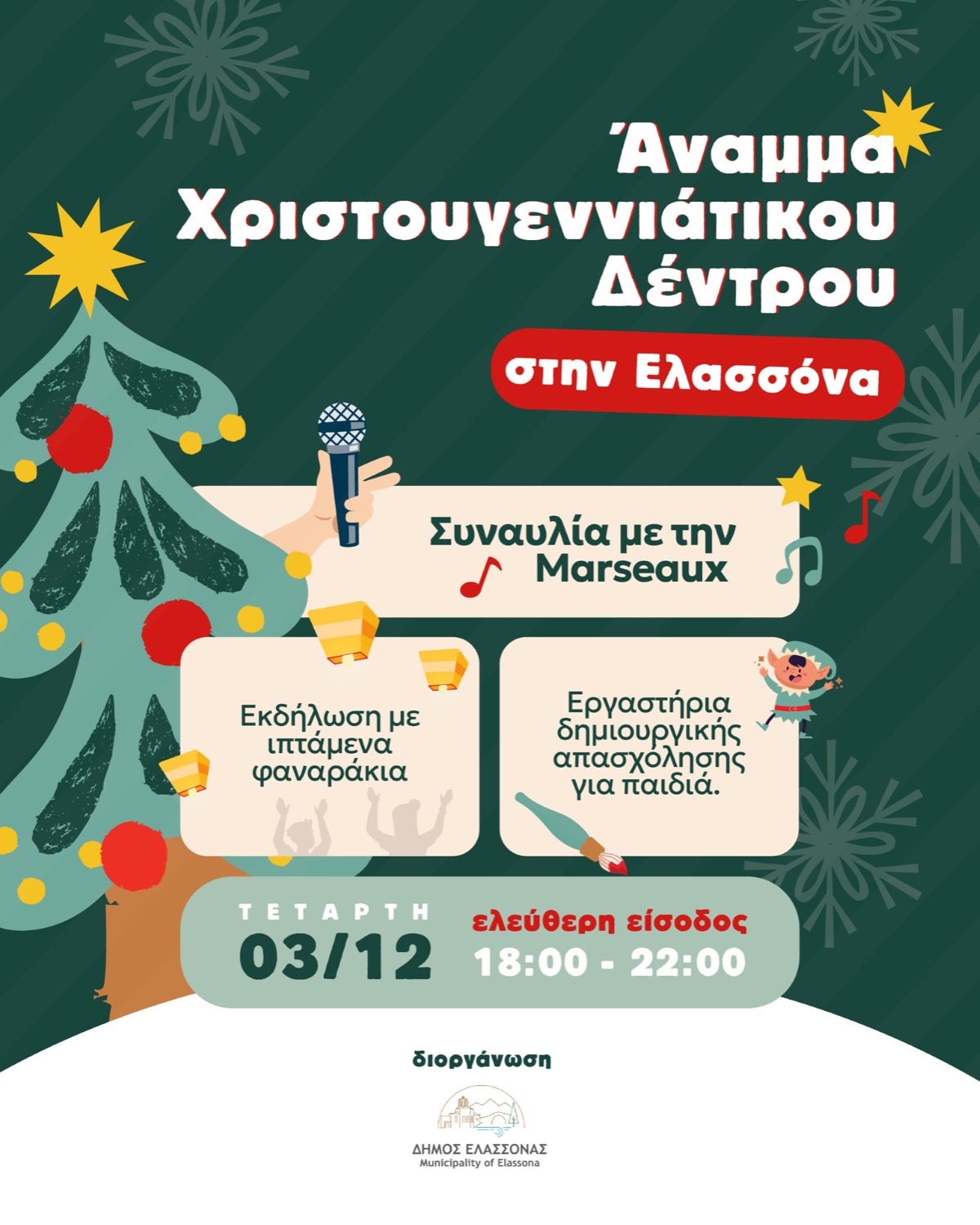 Ο Δήμος Ελασσόνας ενημερώνει τους κατοίκους της ευρύτερης περιοχής, ότι την Τετάρτη 3 Δεκεμβρίου και ώρα 8 μ.μ. αναμένεται να πραγματοποιηθεί το άναμμα του χριστουγεννιάτικου δέντρου.