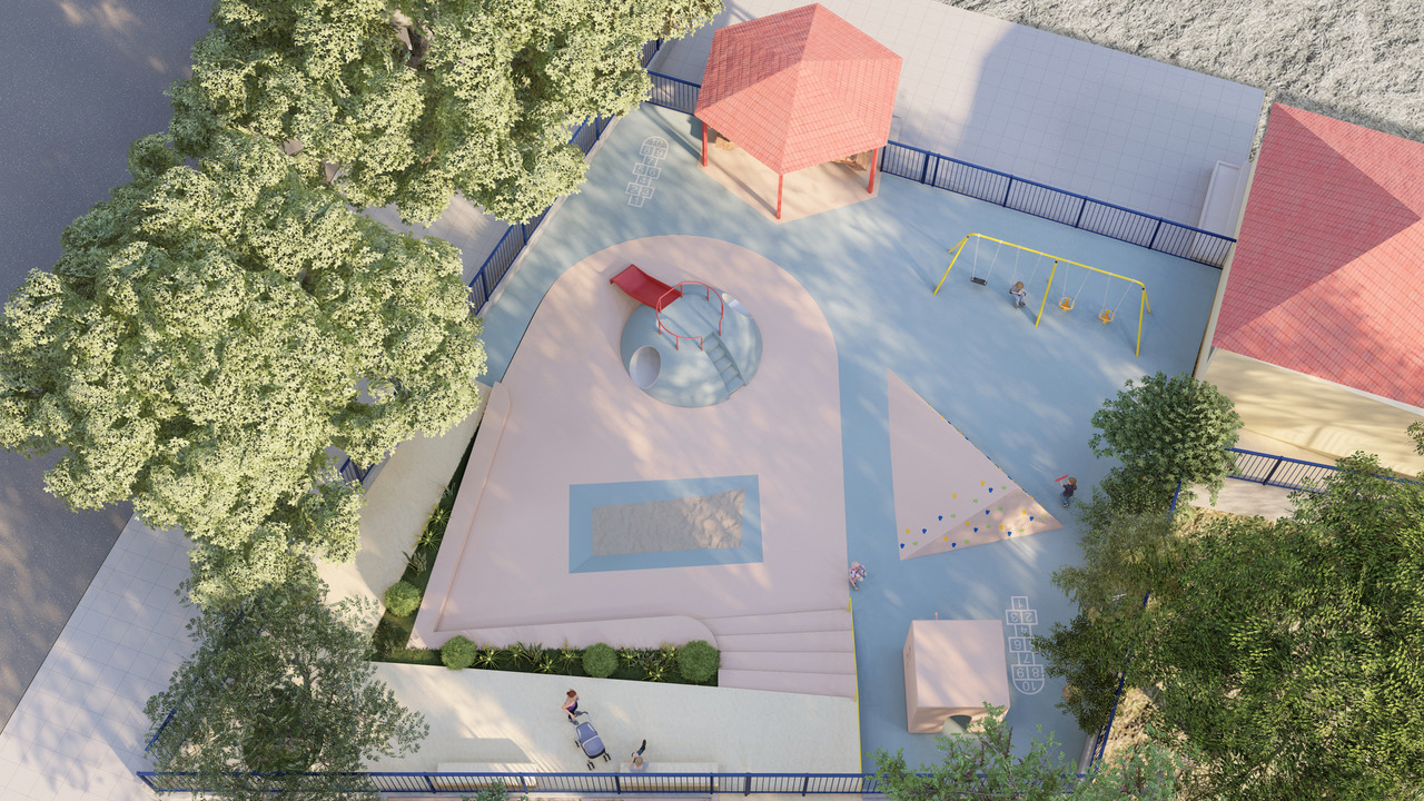 Αυτό επιτυγχάνεται από ένα διπλό σύστημα ελεγχόμενης πρόσβασης που επιτρέπει την ασφαλή λειτουργική ενοποίηση των δύο χώρων. Συγκεκριμένα δημιουργείται νέα πρόσβαση στο όριο της πλατείας και της παιδικής χαράς, καθώς και νέα περίφραξη με θύρα μεταξύ παιδικής χαράς και σχολικής αυλής. Με αυτές τις παρεμβάσεις η παιδική χαρά αποτελεί έναν ενδιάμεσο χώρο που δέχεται τους μαθητές με ασφάλεια κατά τη λειτουργία του σχολείου, ενώ επιτρέπει στους χρήστες την απογευματινή πρόσβαση χωρίς τη δυνατότητα εισόδου στη σχολική μονάδα…».