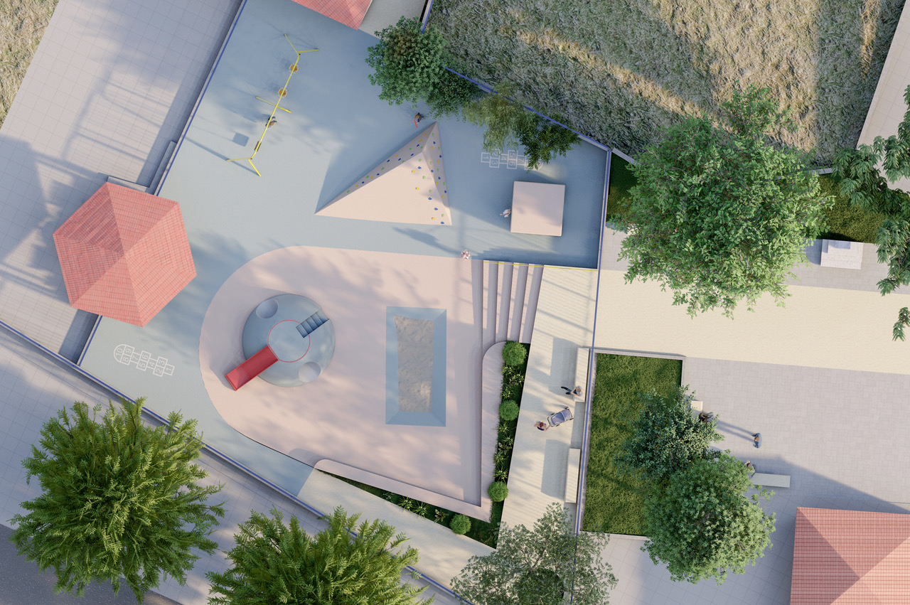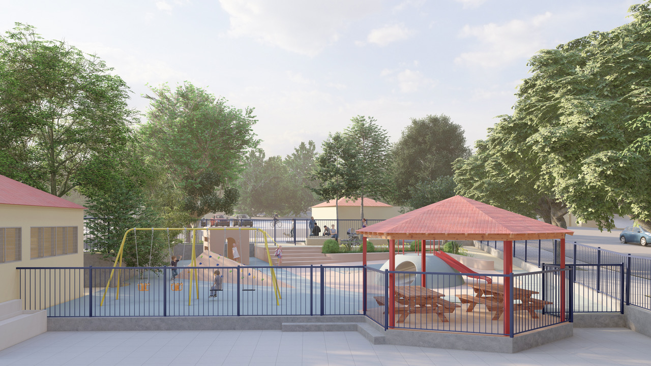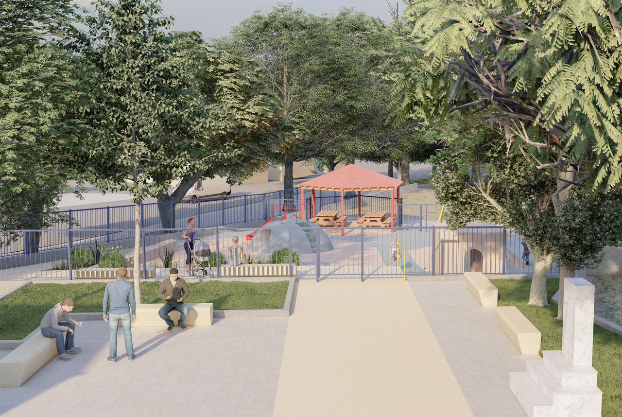 Αυτό επιτυγχάνεται από ένα διπλό σύστημα ελεγχόμενης πρόσβασης που επιτρέπει την ασφαλή λειτουργική ενοποίηση των δύο χώρων. Συγκεκριμένα δημιουργείται νέα πρόσβαση στο όριο της πλατείας και της παιδικής χαράς, καθώς και νέα περίφραξη με θύρα μεταξύ παιδικής χαράς και σχολικής αυλής. Με αυτές τις παρεμβάσεις η παιδική χαρά αποτελεί έναν ενδιάμεσο χώρο που δέχεται τους μαθητές με ασφάλεια κατά τη λειτουργία του σχολείου, ενώ επιτρέπει στους χρήστες την απογευματινή πρόσβαση χωρίς τη δυνατότητα εισόδου στη σχολική μονάδα…».