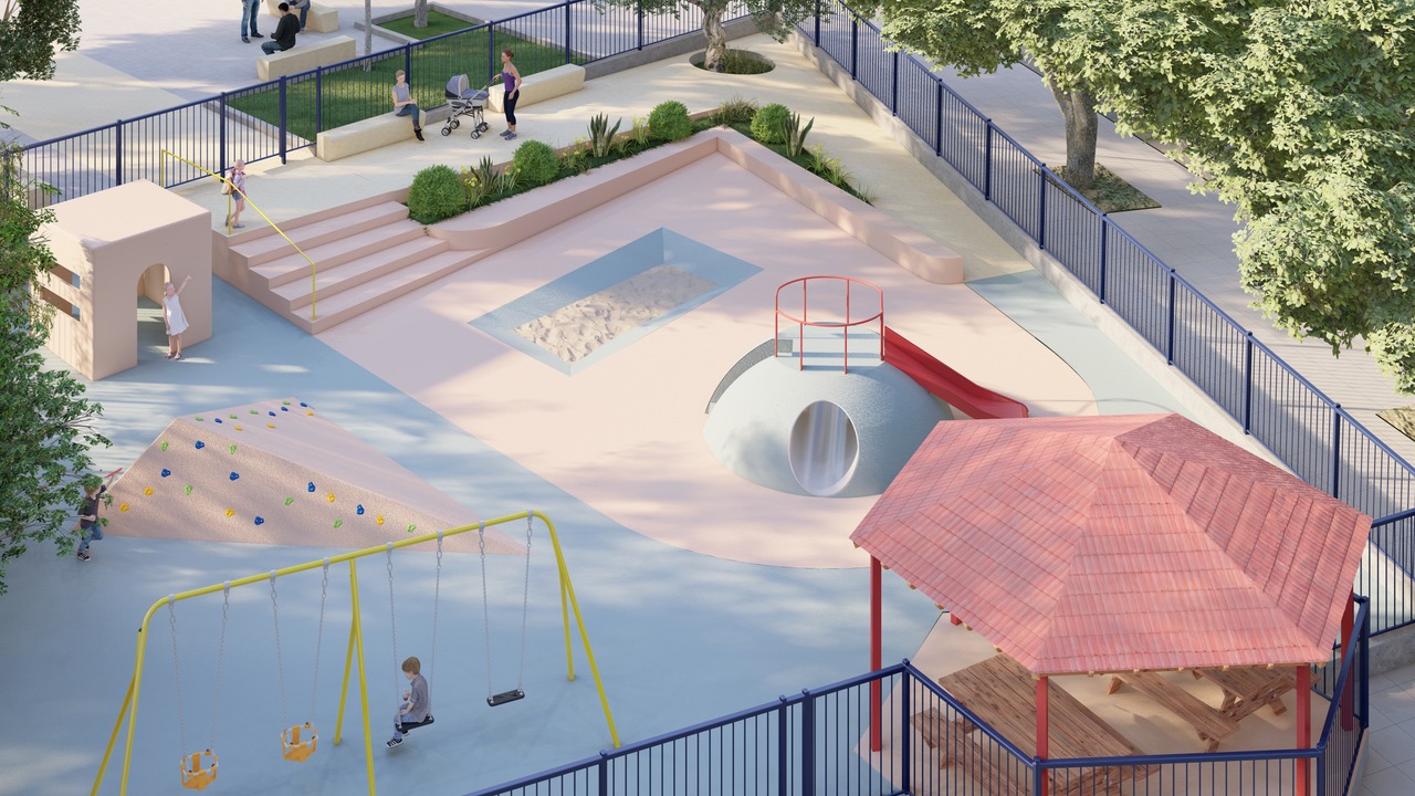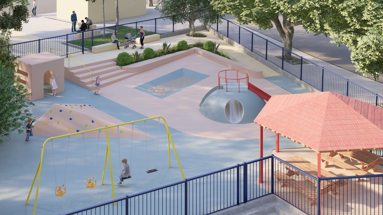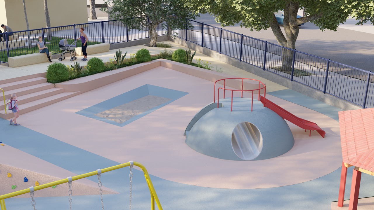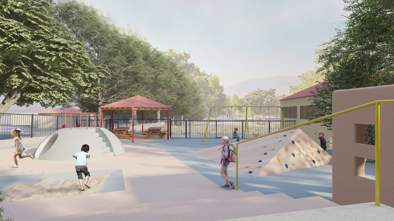Αυτό επιτυγχάνεται από ένα διπλό σύστημα ελεγχόμενης πρόσβασης που επιτρέπει την ασφαλή λειτουργική ενοποίηση των δύο χώρων. Συγκεκριμένα δημιουργείται νέα πρόσβαση στο όριο της πλατείας και της παιδικής χαράς, καθώς και νέα περίφραξη με θύρα μεταξύ παιδικής χαράς και σχολικής αυλής. Με αυτές τις παρεμβάσεις η παιδική χαρά αποτελεί έναν ενδιάμεσο χώρο που δέχεται τους μαθητές με ασφάλεια κατά τη λειτουργία του σχολείου, ενώ επιτρέπει στους χρήστες την απογευματινή πρόσβαση χωρίς τη δυνατότητα εισόδου στη σχολική μονάδα…».