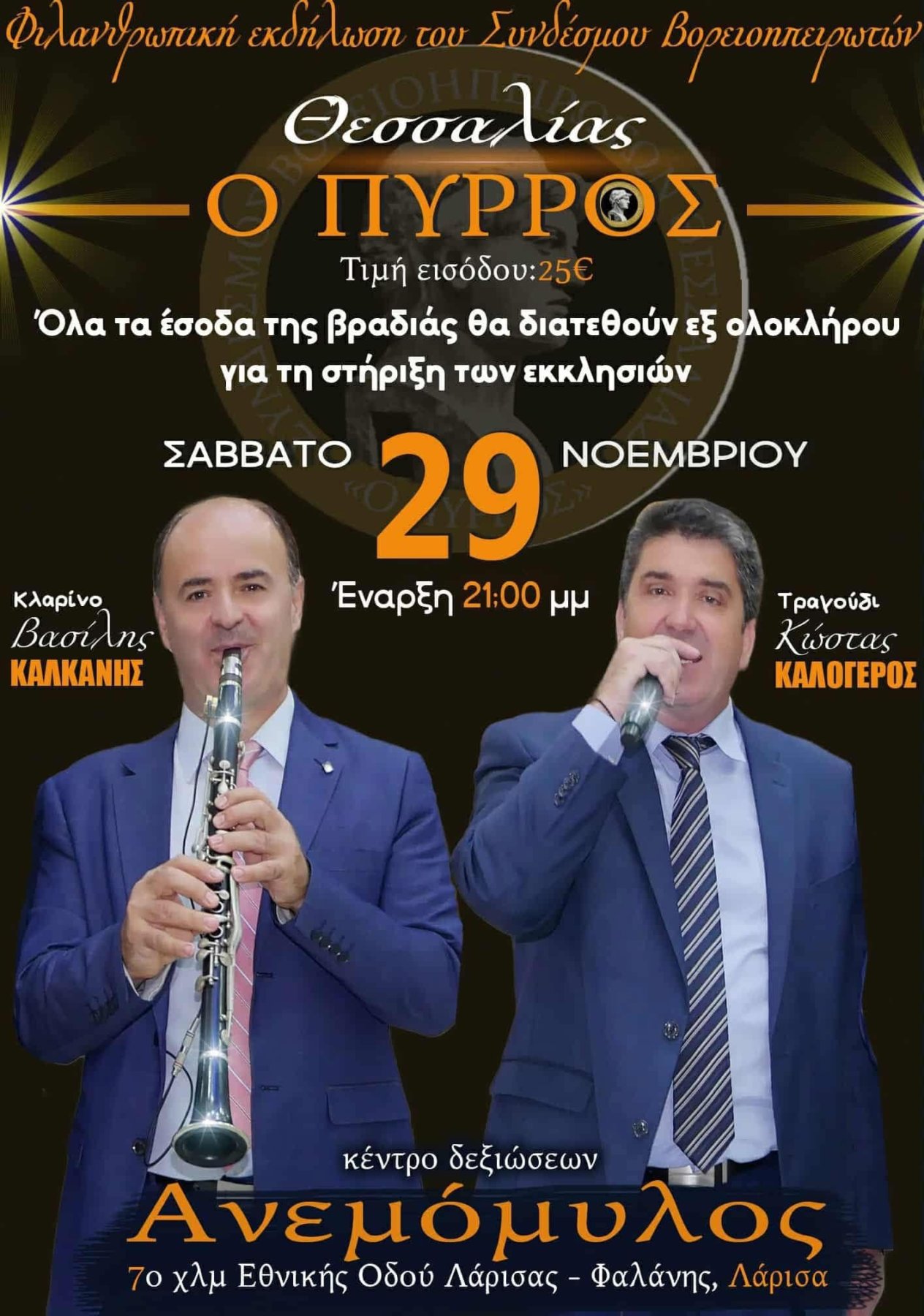 Ο Σύνδεσμος Βορειοηπειρωτών Θεσσαλίας «Ο Πύρρος» διοργανώνει το Σάββατο 29 Νοεμβρίου και ώρα 9.30 στο κέντρο Ανεμόμυλος (7ο χλμ. Λάρισας Φαλάνης) εκδήλωση φιλανθρωπικού χαρακτήρα, με σκοπό τη στήριξη των εκκλησιών που επλήγησαν από τις πρόσφατες πυρκαγιές στα χωριά. Όλα τα έσοδα της βραδιάς θα διατεθούν εξ ολοκλήρου για αυτόν τον ιερό σκοπό.