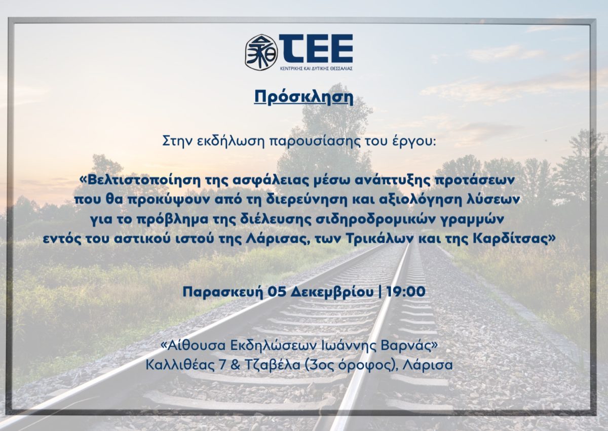 Το Περιφερειακό Τμήμα Κεντρικής & Δυτικής Θεσσαλίας του ΤΕΕ, διοργανώνει εκδήλωση παρουσίασης του Έργου με τίτλο: «Βελτιστοποίηση της ασφάλειας μέσω ανάπτυξης προτάσεων που θα προκύψουν από τη διερεύνηση και αξιολόγηση λύσεων για το πρόβλημα της διέλευσης σιδηροδρομικών γραμμών εντός του αστικού ιστού της Λάρισας, των Τρικάλων και της Καρδίτσας».
