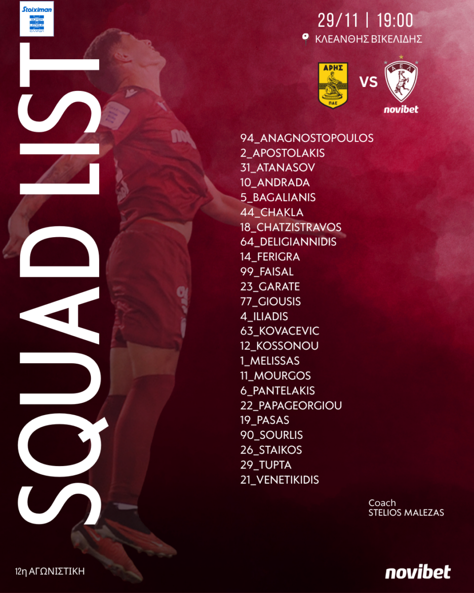 Η αποστολή της ΑΕΛ για τον αγώνα με τον Άρη