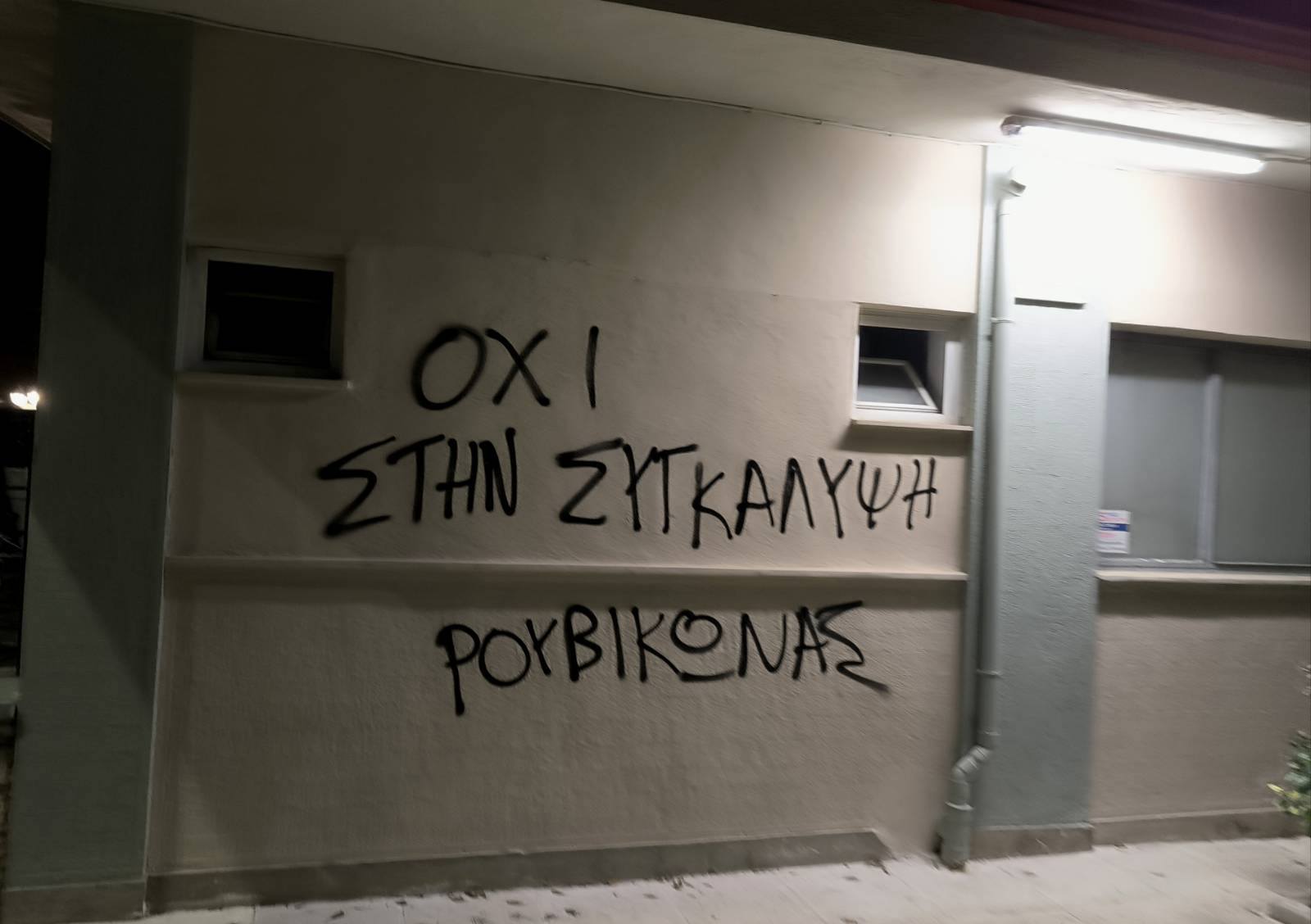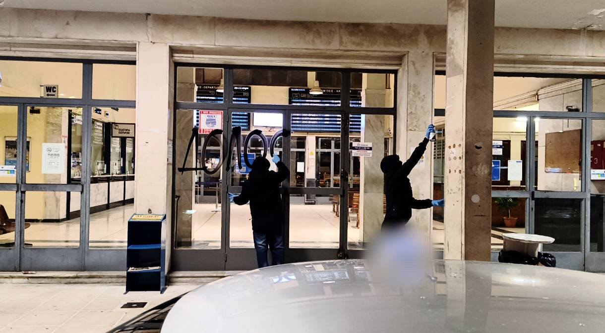 Παρέμβαση του “Ρουβίκωνα” στο κτίριο του ΟΣΕ στη Λάρισα με αφορμή τη σημερινή δίκη (φωτο)