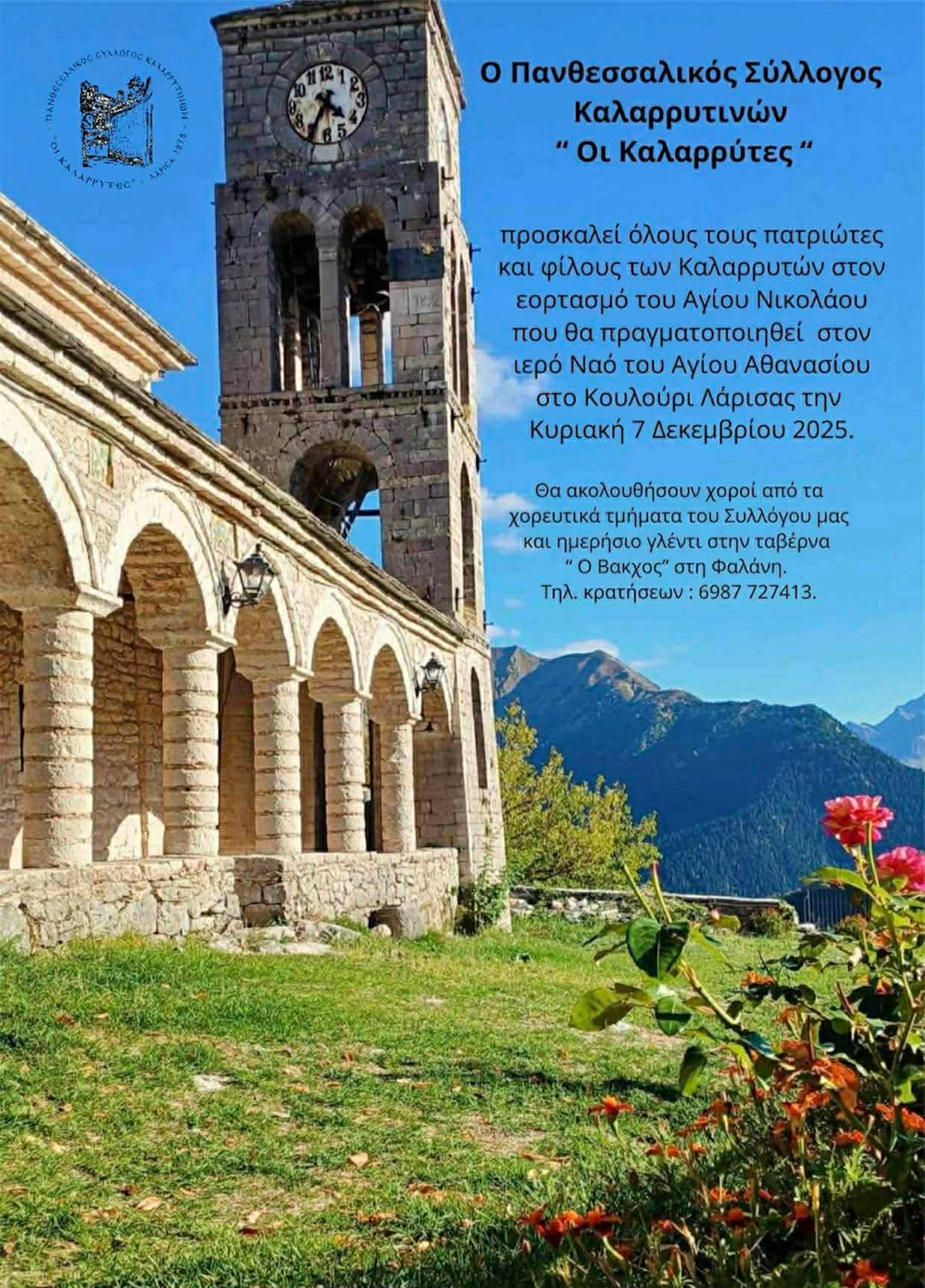 Ο Πανθεσσαλικός Σύλλογος Καλαρρυτινών “ΟΙ ΚΑΛΑΡΡΥΤΕΣ” διοργανώνει τον εορτασμό του Αγίου Νικολάου που θα πραγματοποιηθεί στον Ιερό Ναό του Αγίου Αθανασίου στο Κουλούρι Λάρισας, την Κυριακή 7 Δεκεμβρίου 2025.