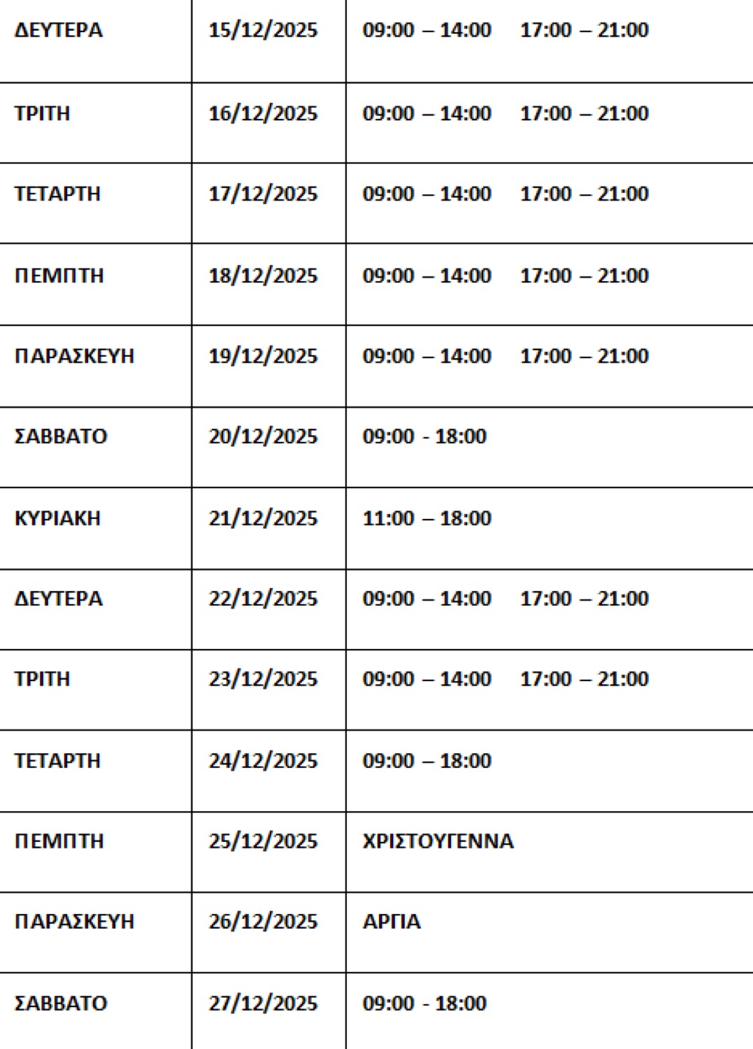 Ενημέρωση του Εμπορικού Συλλόγου Λάρισας για το προτεινόμενο ωράριο λειτουργίας των καταστημάτων για την εορταστική περίοδο Χριστουγέννων- Πρωτοχρονιάς 2025, όπως αποφασίστηκε από το Διοικητικό Συμβούλιο.