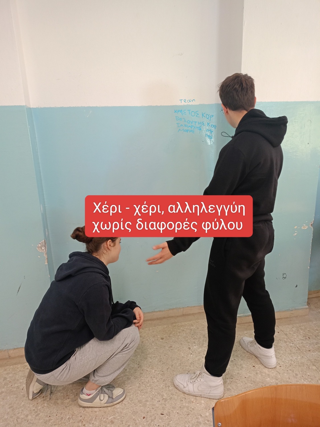Στη δεύτερη εικόνα μια μαθήτρια είναι σκυμμένη, σε στάση που αποτυπώνει ευαλωτότητα ή ανάγκη για υποστήριξη, και ένα αγόρι τείνει το χέρι του προς εκείνη, προσφέροντας βοήθεια. Πρόκειται για μια λιτή αλλά δυνατή χειρονομία, που αναδεικνύει πως αγόρια και κορίτσια πρέπει να στέκονται το ένα δίπλα στο άλλο, χωρίς στερεότυπα, με κατανόηση και αλληλεγγύη.