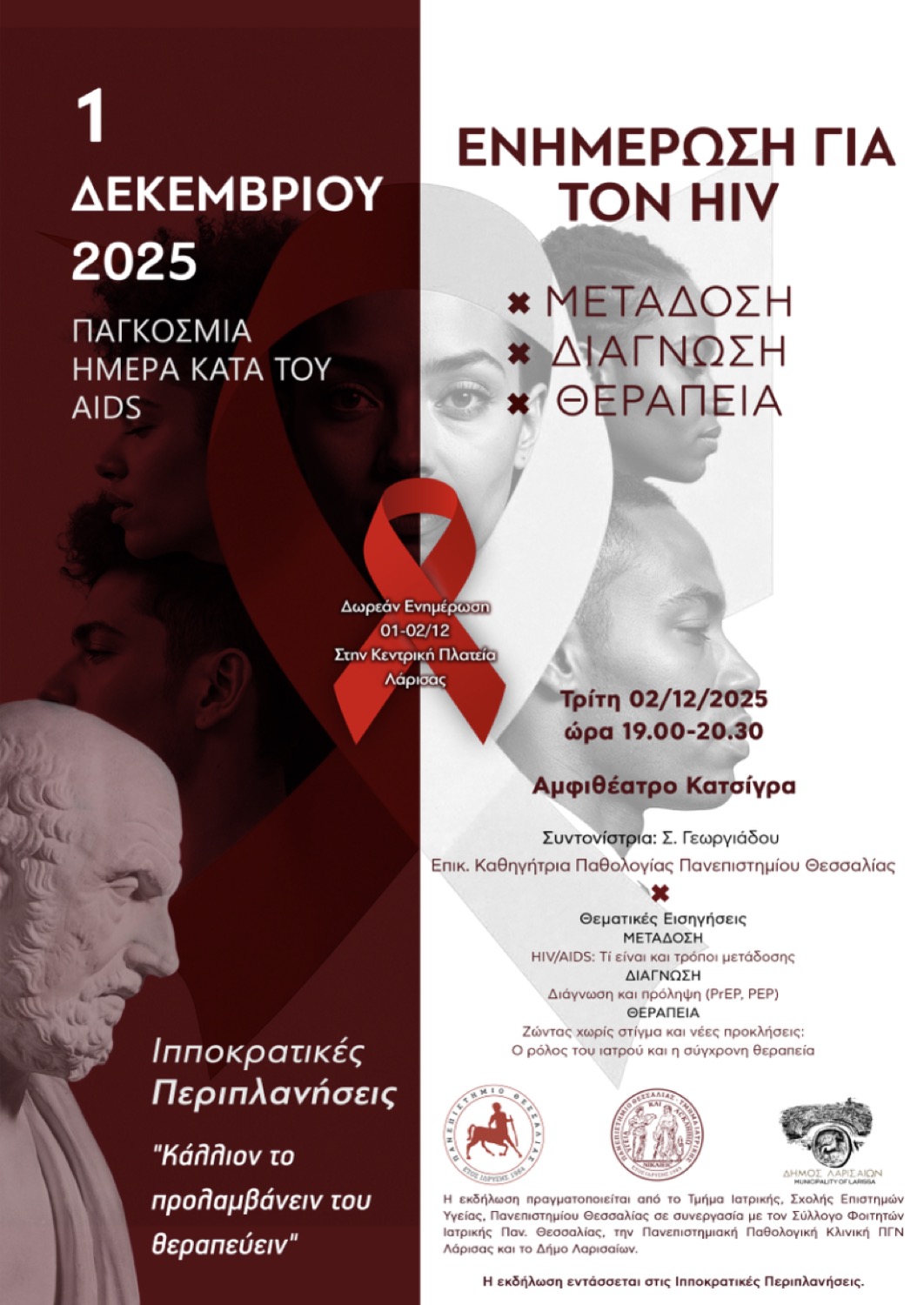 Με αφορμή την Παγκόσμια Ημέρα κατά του AIDS, το Τμήμα Ιατρικής της Σχολής Επιστημών Υγείας του Πανεπιστημίου Θεσσαλίας, σε συνεργασία με τον Σύλλογο Φοιτητών Ιατρικής Π.Θ., την Πανεπιστημιακή Παθολογική Κλινική ΠΓΝ Λάρισας και τον Δήμο Λαρισαίων, διοργανώνει δράσεις ενημέρωσης και μια ανοιχτή επιστημονική εκδήλωση για το κοινό.
