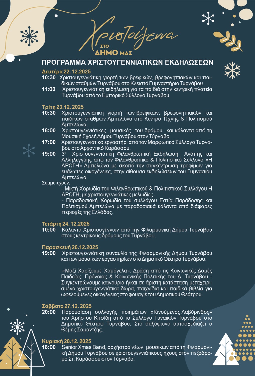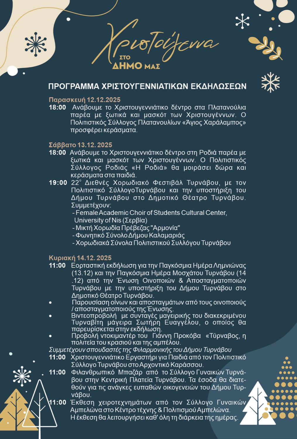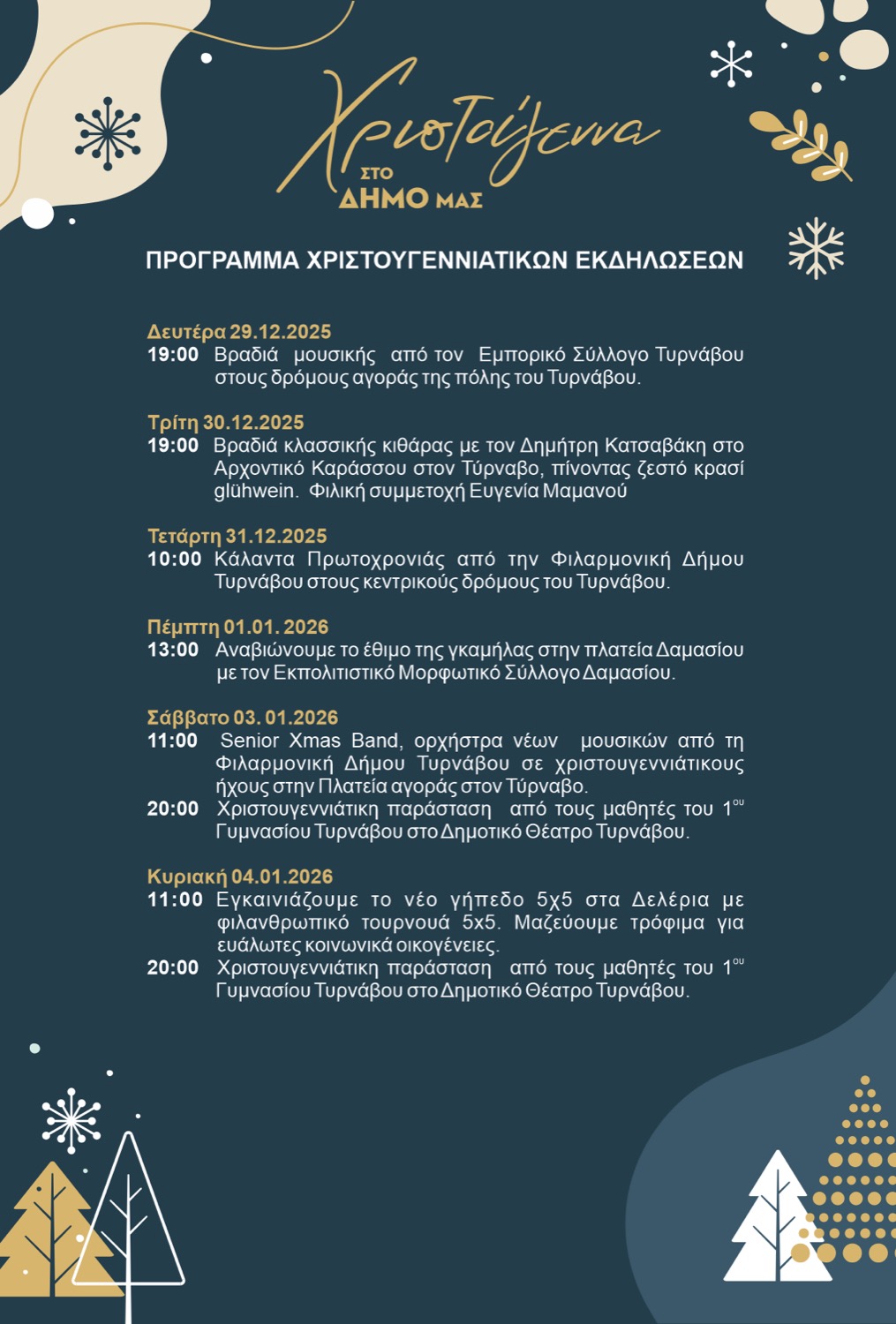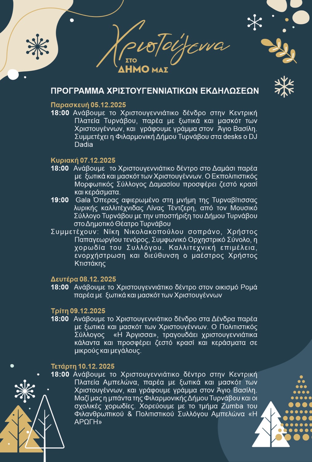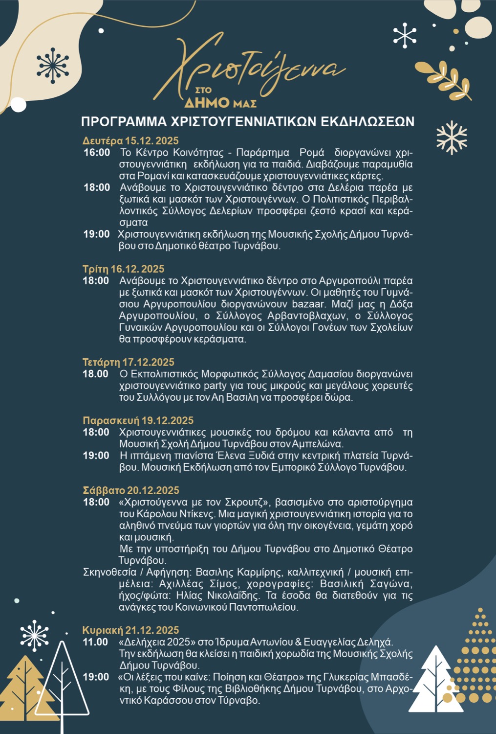 Το εορταστικό πρόγραμμα του Δήμου Τυρνάβου ενόψει Χριστουγέννων