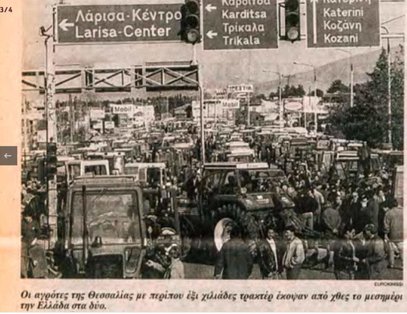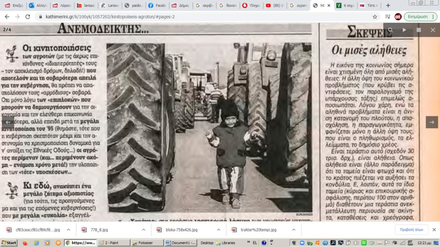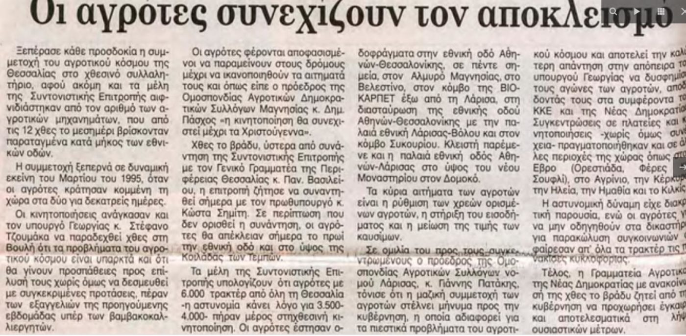 Βέβαια την «ένδοξη» εποχή από το 1995-1997 στα μπλόκα δεν την έζησα εκ των έσω. Το 1996 που για 58 ημέρες παρατάξανε τα τρακτέρ στον ιστορικό κόμβο της Βιοκαρπέτ και φύγανε στις 23 Δεκεμβρίου, ή το 1997 που έγινε η καταδρομική ενέργεια της κυβέρνησης Σημίτη στις Μικροθήβες, την ημέρα που έφτασαν εκεί τα τρακτέρ από την Καρδίτσα· τα χαράματα η αστυνομία ξεφούσκωσε τα λάστιχα των τρακτέρ και έριξε ζάχαρη στις μηχανές τους. Πήγαινα σχολείο και έδινα πανελλήνιες. Μέχρι το τέλος της δεκαετίας του 1990 οι κινητοποιήσεις ήταν πραγματικά τεράστιες, με αμέτρητα τρακτέρ· βόλευε και η χωροταξική κατάσταση των δρόμων τότε… η ΠΑΘΕ ήταν υπό κατασκευή.