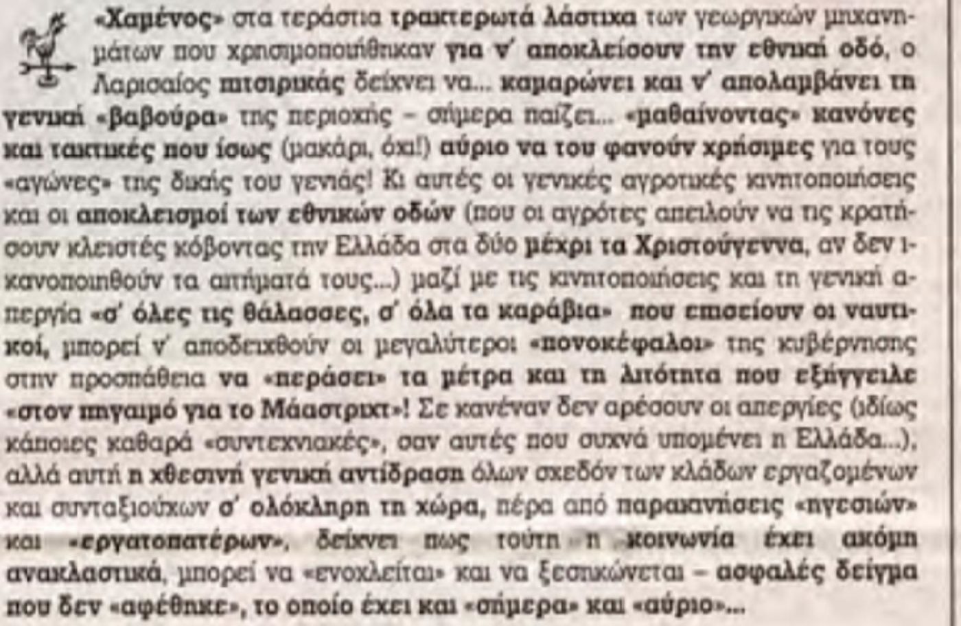 Αλλά και ποιος να ξεχάσει το φωτορεπορτάζ που δημοσίευσε ο Γιώργος Παπαχρήστος στα ΝΕΑ με τους συνδικαλιστές να τα σπάνε σε μπουζούκια δίπλα από τα μπλόκα, λίγη ώρα μετά τις ζωντανές συνδέσεις των βραδινών δελτίων, γεγονός που καταδικάστηκε ομοφώνως από τις συντονιστικές επιτροπές αγώνα. Το σύνθημα ήταν πάντα «όλα τα κιλά, όλα τα λεφτά». Αφορούσε το βαμβάκι, μπορεί να λοιδορήθηκε και να παρεξηγήθηκε πολύ αλλά το φώναζαν όλοι.