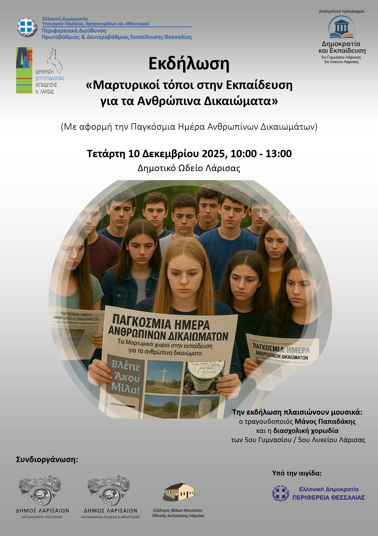 Με αφορμή την Παγκόσμια Ημέρα Ανθρωπίνων Δικαιωμάτων, η Διεύθυνση Δευτεροβάθμιας Εκπαίδευσης Λάρισας και η παιδαγωγική ομάδα του διασχολικού προγράμματος «Δημοκρατία και Εκπαίδευση» των 5ου Γυμνασίου και 5ου Λυκείου Λάρισας, διοργανώνουν εκδήλωση με τίτλο «Μαρτυρικοί τόποι στην Εκπαίδευση για τα Ανθρώπινα Δικαιώματα», την Τετάρτη 10 Δεκεμβρίου 2025 – ανήμερα της Παγκόσμιας ημέρας, στο Δημοτικό Ωδείο Λάρισας, τις ώρες 10:00-13:00.