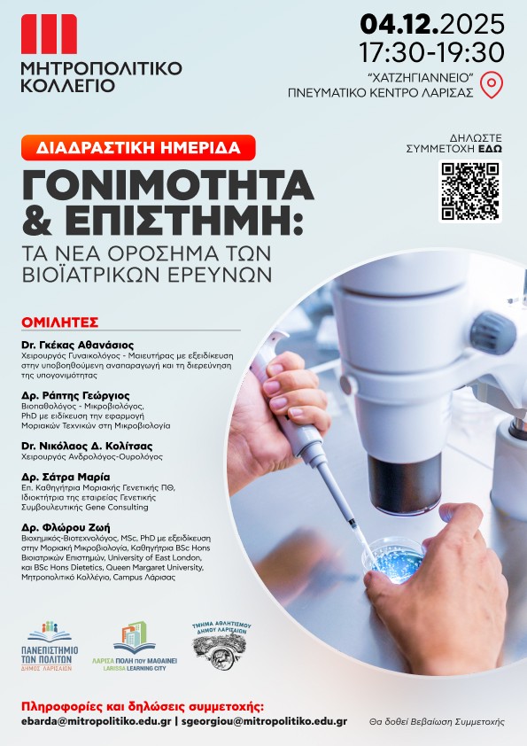 Το Πανεπιστήμιο των Πολιτών του Δήμου Λαρισαίων, στο πλαίσιο της «Λάρισα – Πόλη που Μαθαίνει», σε συνεργασία με τη Σχολή των Βιοϊατρικών Επιστημών (BSc, Hons, University of East London) του Μητροπολιτικού Κολλεγίου, διοργανώνουν την ημερίδα «Γονιμότητα & Επιστήμη: Τα Νέα Ορόσημα των Βιοϊατρικών Ερευνών», η οποία θα πραγματοποιηθεί την Πέμπτη 4 Δεκεμβρίου 2025, ώρα 17:30-19:30, στο Χατζηγιάννειο Πνευματικό Κέντρο.