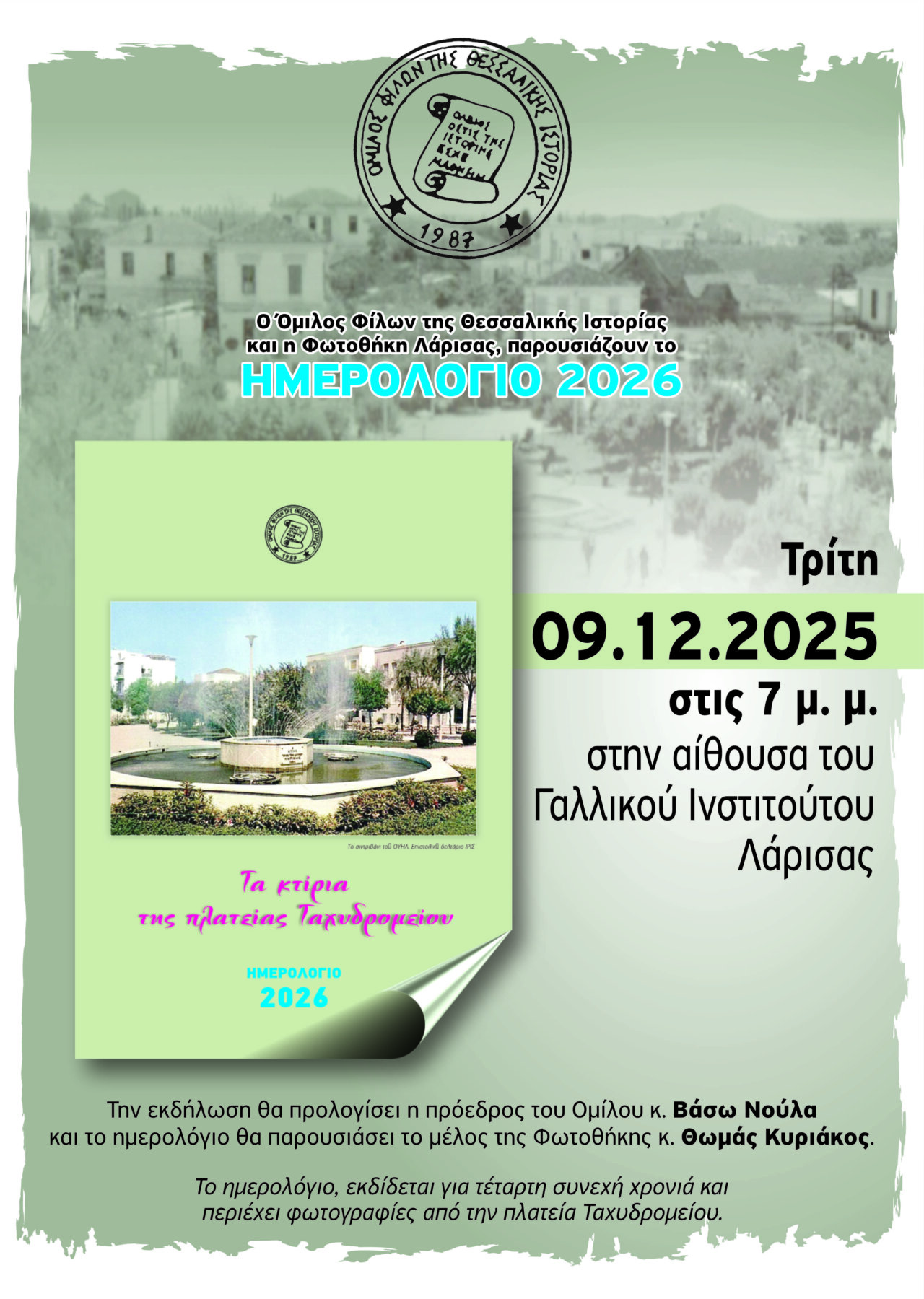 Ο Όμιλος Φίλων της Θεσσαλικής Ιστορίας και η Φωτοθήκη Λάρισας, διοργανώνουν εκδήλωση παρουσίασης του ημερολογίου 2026, την Τρίτη 9 Δεκεμβρίου 2025 στις 7 μ. μ., στην αίθουσα του Γαλλικού Ινστιτούτου Λάρισας.