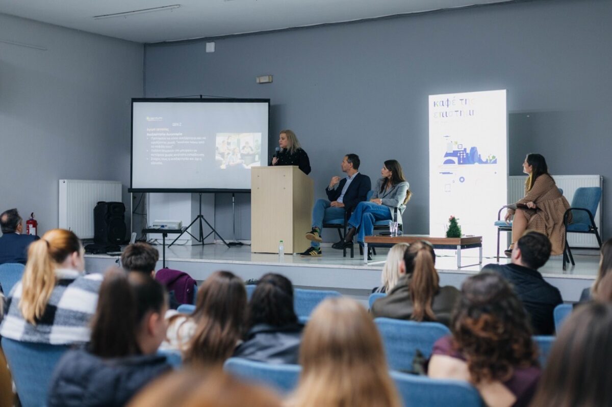 Η εκδήλωση ξεκίνησε με την ομιλία της Νεφέλης Μπιρμπάκου, η οποία επέστρεψε στον τόπο καταγωγής της μοιράζοντας με το κοινό τη δική της διαδρομή από τις σπουδές στη Διοίκηση Επιχειρήσεων μέχρι τη δημιουργία της εκπαιδευτικής εταιρείας Shift Education. Με προσωπικό τόνο περιέγραψε τις δυσκολίες, τις ανατροπές και τις ευκαιρίες που προέκυψαν χάρη στην επιμονή, τις τυχαίες αλλά καθοριστικές συναντήσεις και τη συνεχή διάθεση για επανεκκίνηση.