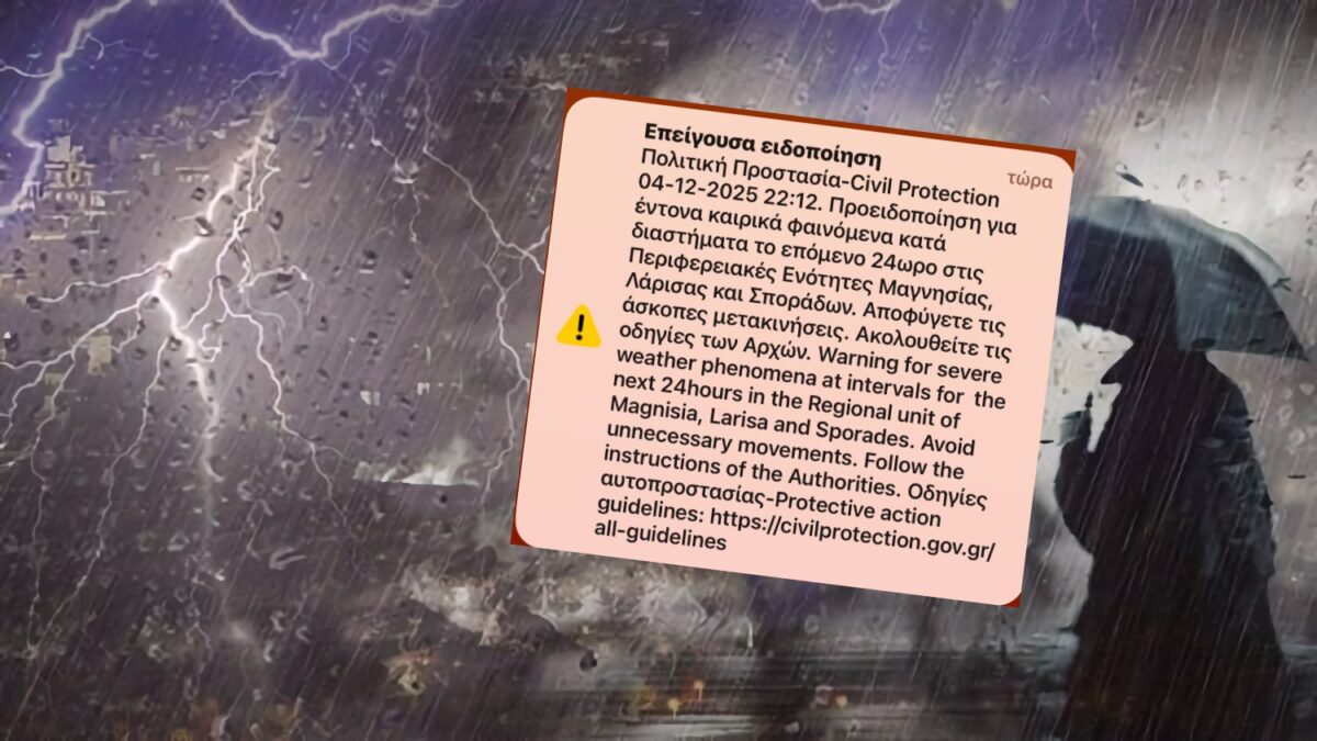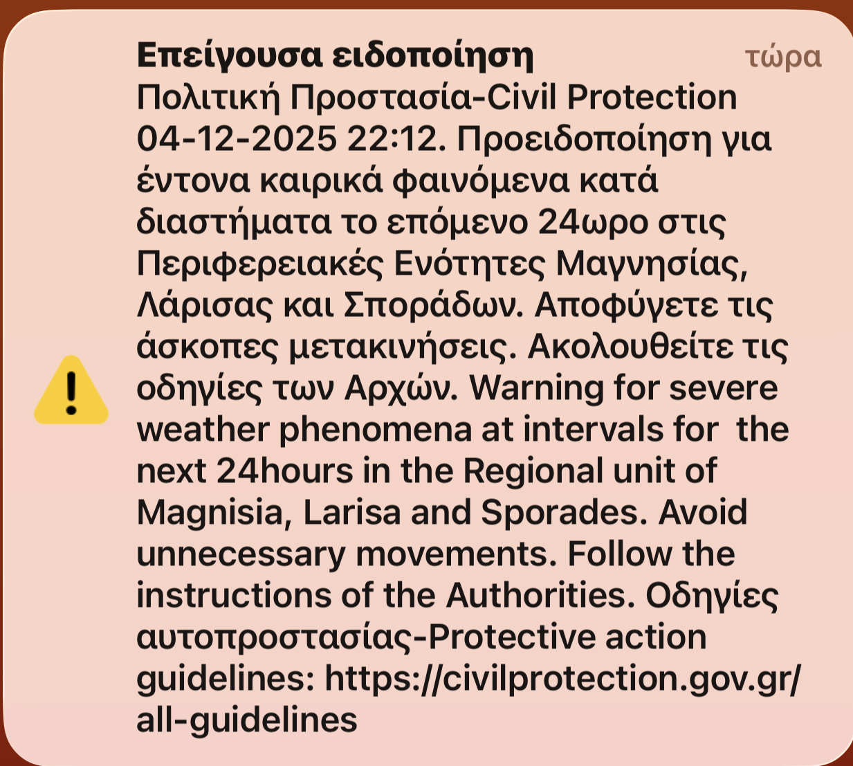 04-12-2025 22:12. Προειδοποίηση για έντονα καιρικά φαινόμενα κατά διαστήματα το επόμενο 24ωρο στις Περιφερειακές Ενότητες Μαγνησίας, Λάρισας και Σποράδων. Αποφύγετε τις άσκοπες μετακινήσεις. Ακολουθείτε τις οδηγίες των Αρχών.»