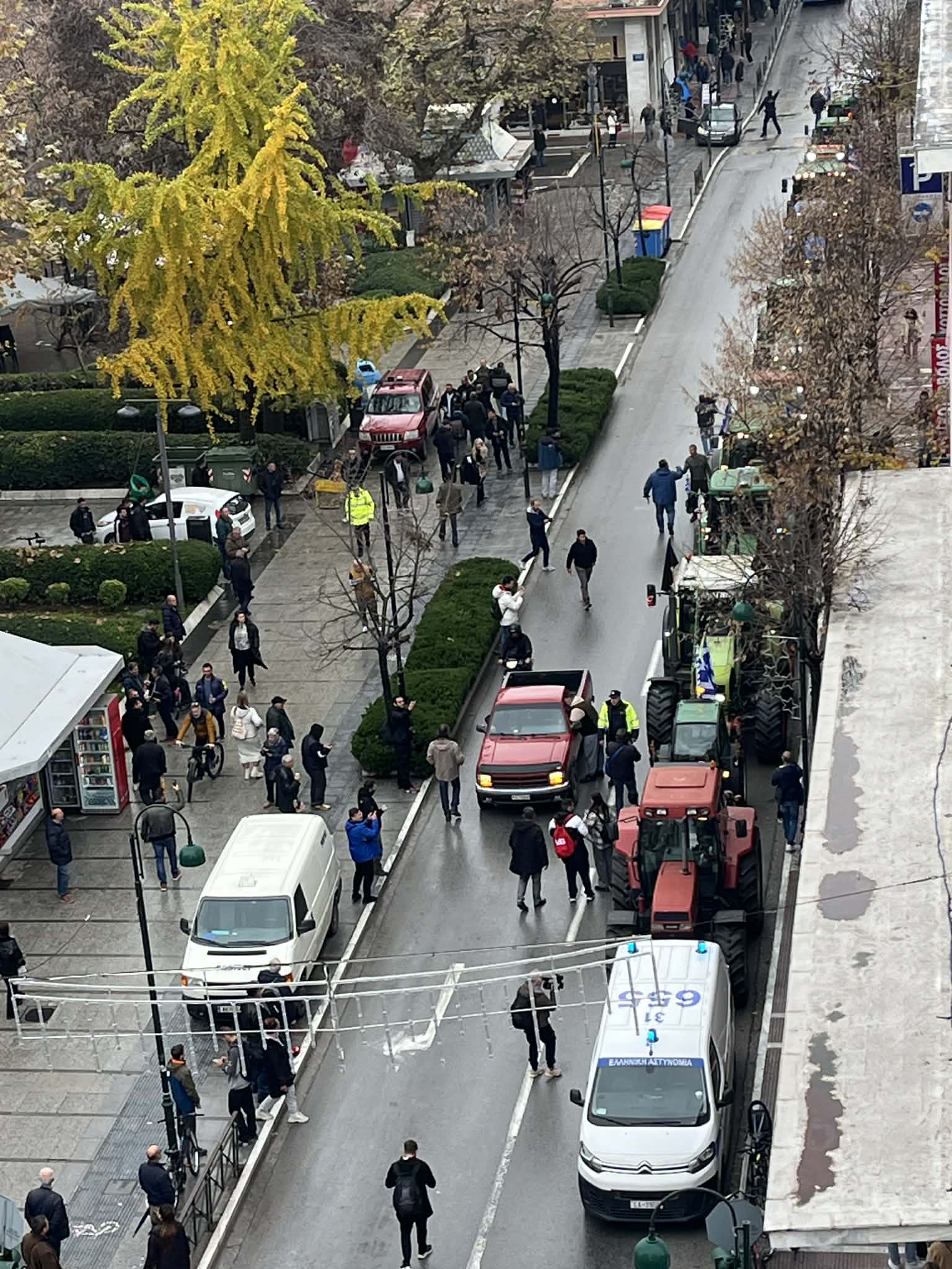 Λίγο πριν τη δίκη μια ντουζίνα τρακτέρ ξεσηκώνοντας με κορναρίσματα το κέντρο, κατέφτασαν στην Κεντρική πλατεία από το μπλόκο της Νίκαιας για συμπαράσταση των αγροτών στους συναδέλφους τους ζητώντας την αθώωσή τους.