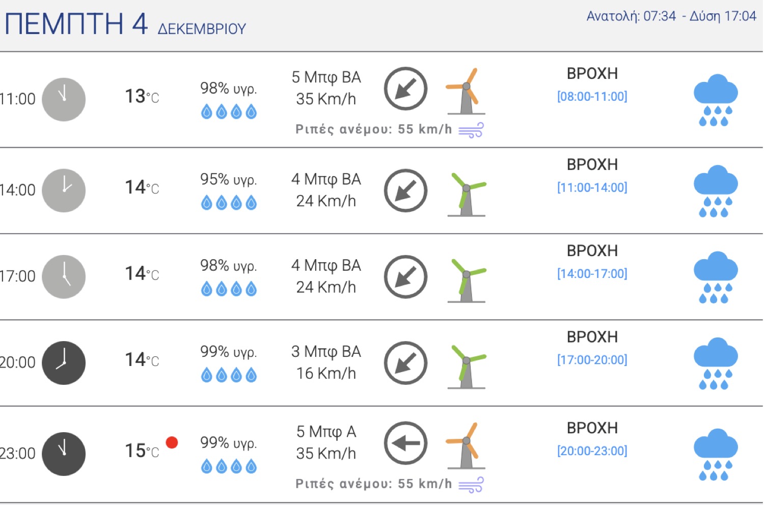 Ακόμη, επισημαίνεται πως οι βροχοπτώσεις εκτός της μεγάλης έντασης θα έχουν και μεγάλη διάρκεια. Τα ισχυρά φαινόμενα σε πολλές περιοχές θα συνοδεύονται από τοπικές χαλαζοπτώσεις και κατά διαστήματα από πολύ ισχυρούς ανέμους, η ένταση των οποίων την Παρασκευή (05-12-2025) στη νοτιοανατολική νησιωτική χώρα θα φτάσει τα 8 και πιθανώς πρόσκαιρα τα 9 μποφόρ.