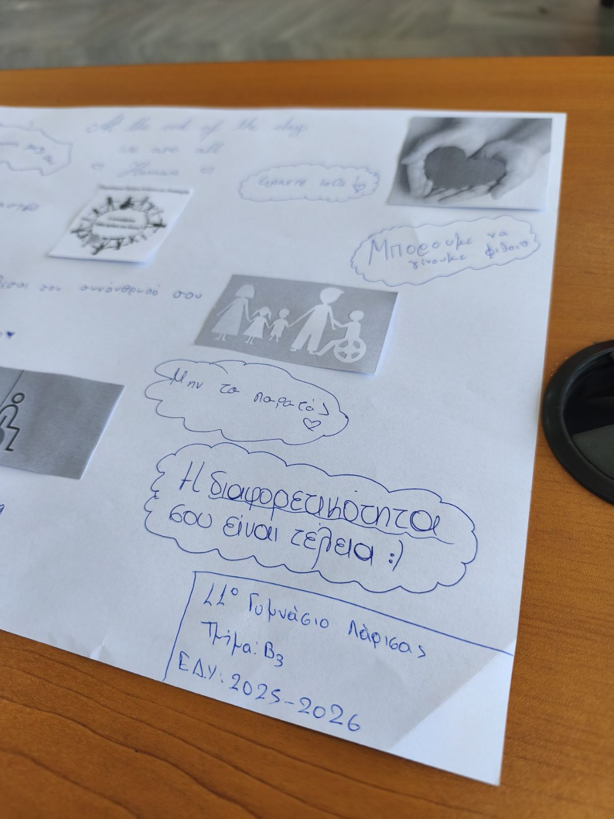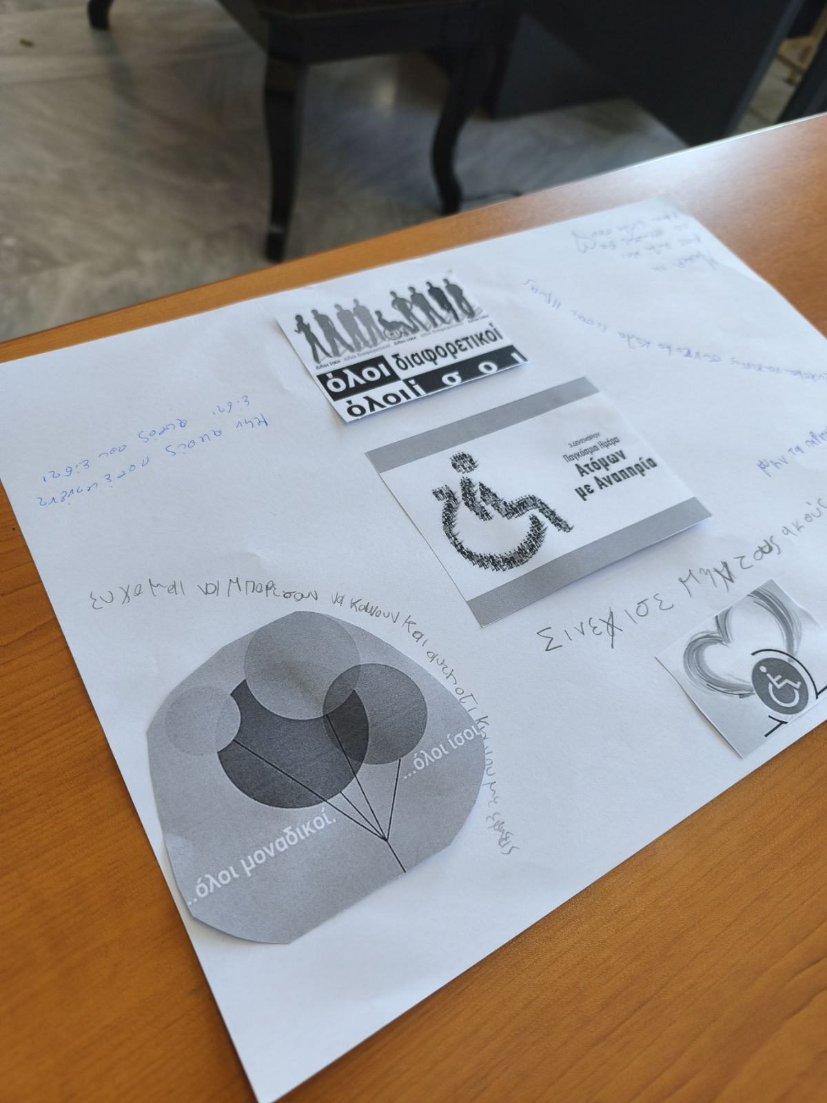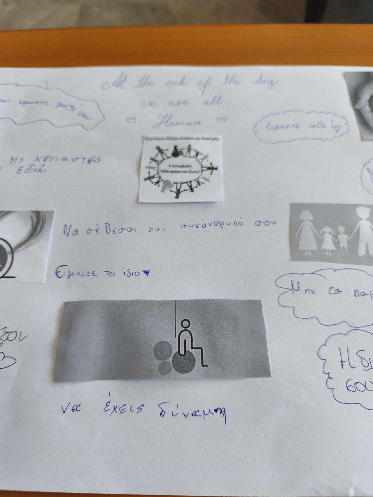 Οι μαθητές στη συνέχεια ενθαρρύνθηκαν με τη συμμετοχή τους σε βιωματική δράση να συναισθανθούν τον κοινωνικό αποκλεισμό που βιώνουν τα άτομα με αναπηρίες και κατανόησαν πως όλοι οι άνθρωποι αξίζουν ίσες ευκαιρίες. Οι μαθητές δημιούργησαν αφίσα στέλνοντας τα τα δικά τους μηνύματα στους συνανθρώπους τους με αναπηρία.