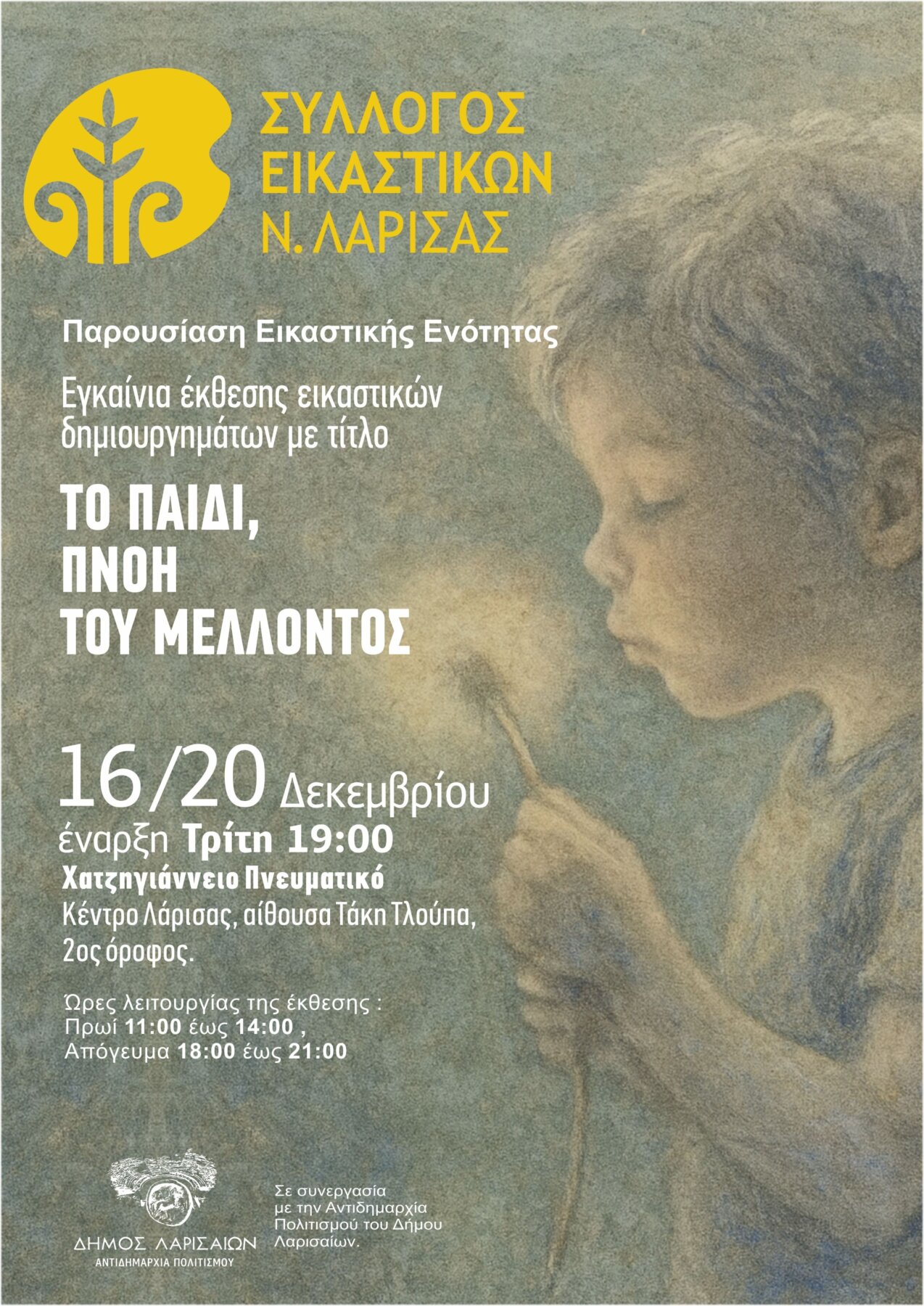 Ο Σύλλογος Εικαστικών Ν. Λάρισας, σε συνεργασία με την Αντιδημαρχία Πολιτισμού του Δήμου Λαρισαίων, διοργανώνουν έκθεση εικαστικών δημιουργημάτων με τίτλο, “ΠΑΙΔΙ, ΠΝΟΗ ΤΟΥ ΜΕΛΛΟΝΤΟΣ”.