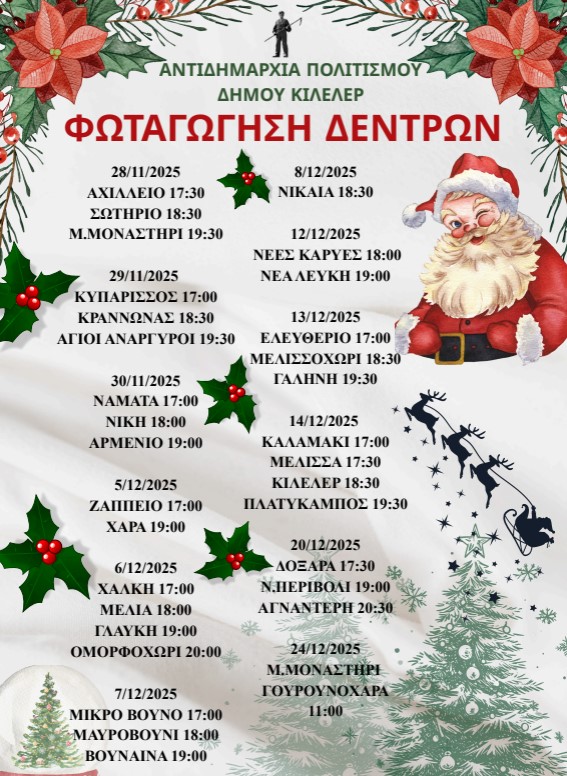 Ξεκίνησαν με ιδιαίτερη επιτυχία η χριστουγεννιάτικες εκδηλώσεις με την φωταγώγηση των χριστουγεννιάτικων δέντρων στον Δήμο Κιλελέρ. Τα πρώτα δέντρα άναψαν στο Αχίλλειο, στο Σωτήριο στο Μεγάλο Μοναστήρι, στην Κυπάρισσο, στον Κραννώνα, στους Αγίους Αναργύρους στα Νάματα, στη Νίκη και στο Αρμένιο.
