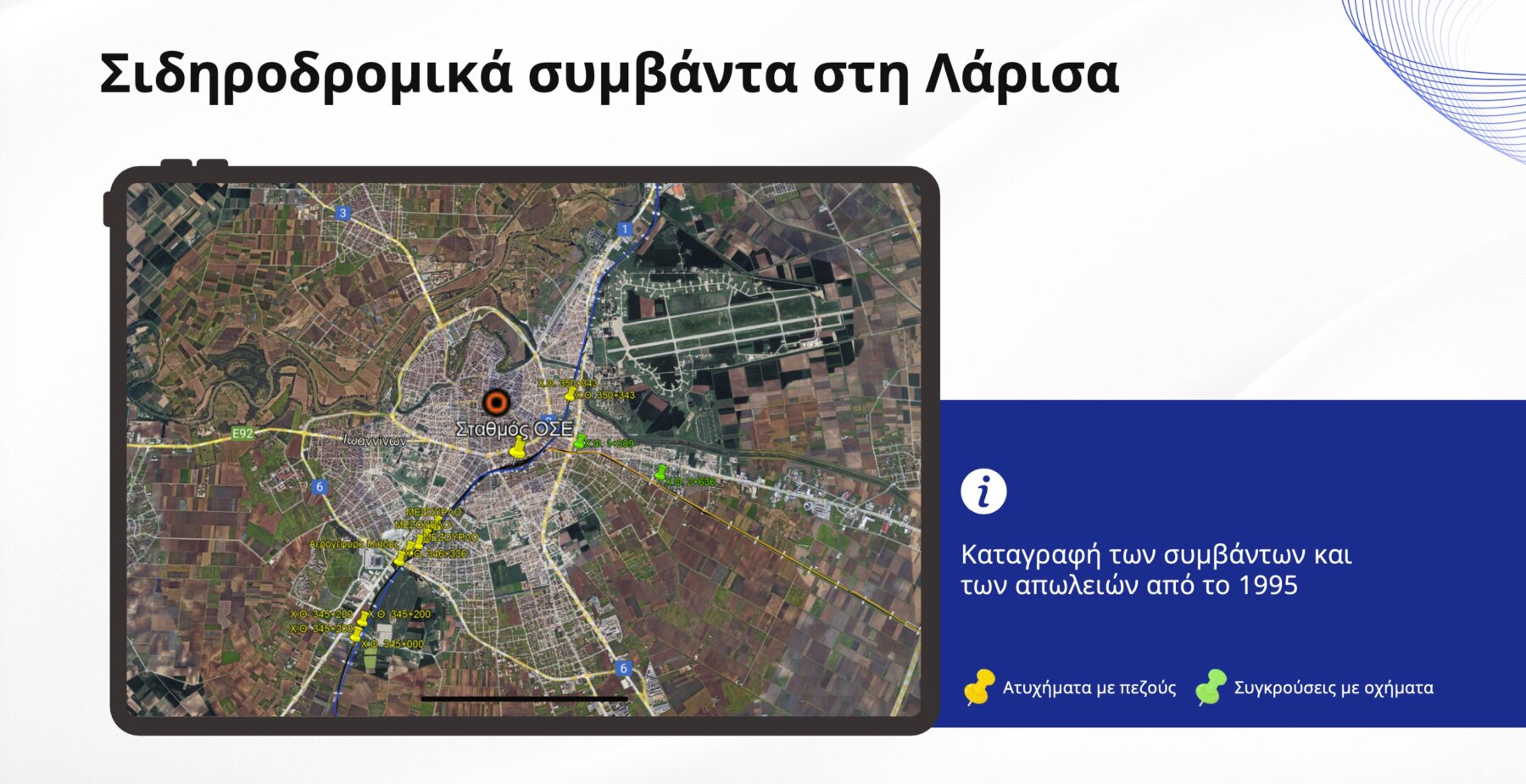 Η χωρική ανάλυση των σιδηροδρομικών ατυχημάτων καταδεικνύει πως η συντριπτική πλειοψηφία των συμβάντων στον άξονα Αθήνα – Θεσσαλονίκη συμβαίνει εντός της Λάρισας. Παράλληλα, και στον άξονα Λάρισας – Βόλου εντοπίζεται σημαντική διασπορά συμβάντων κοντά στον αστικό ιστό.