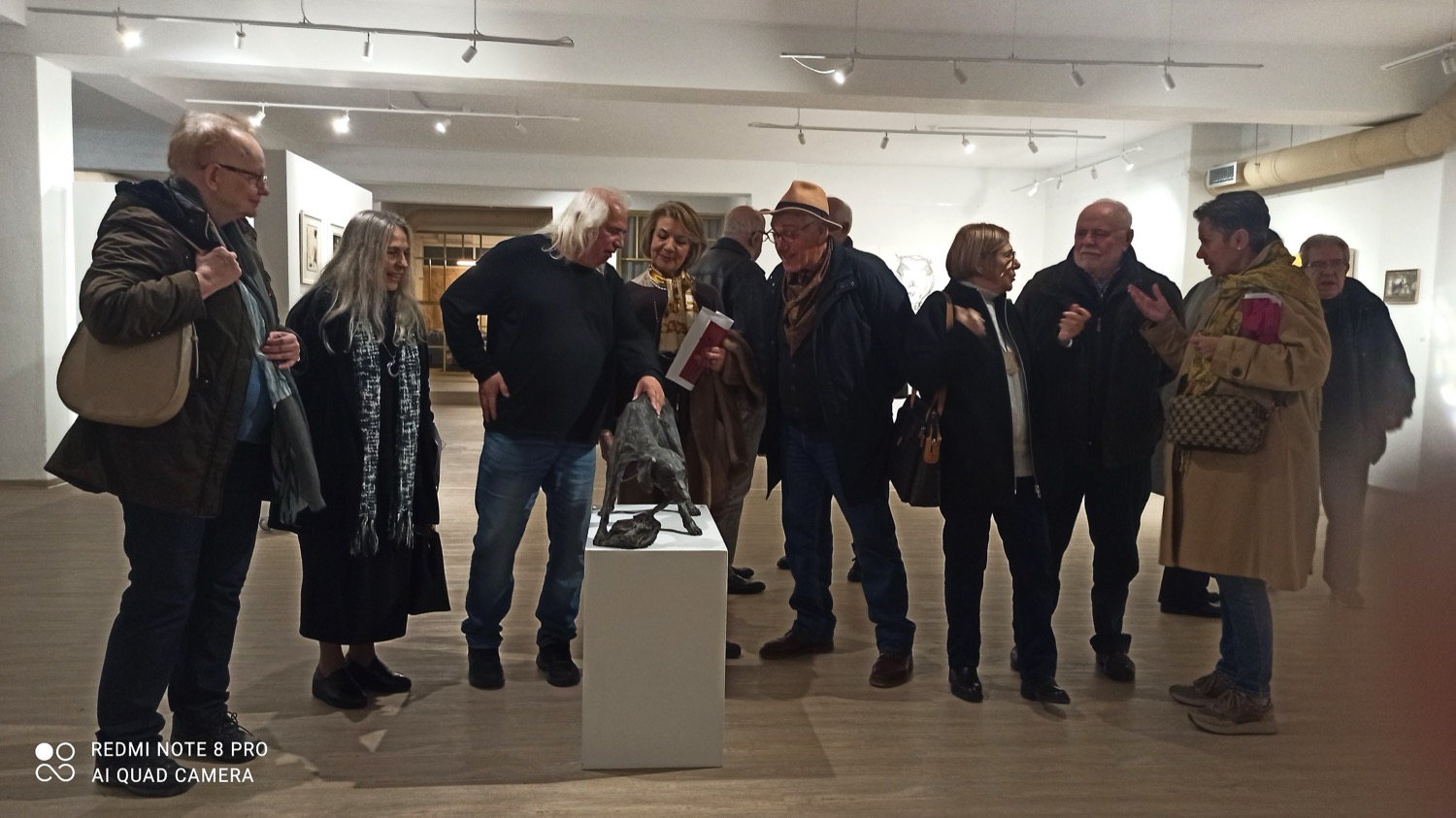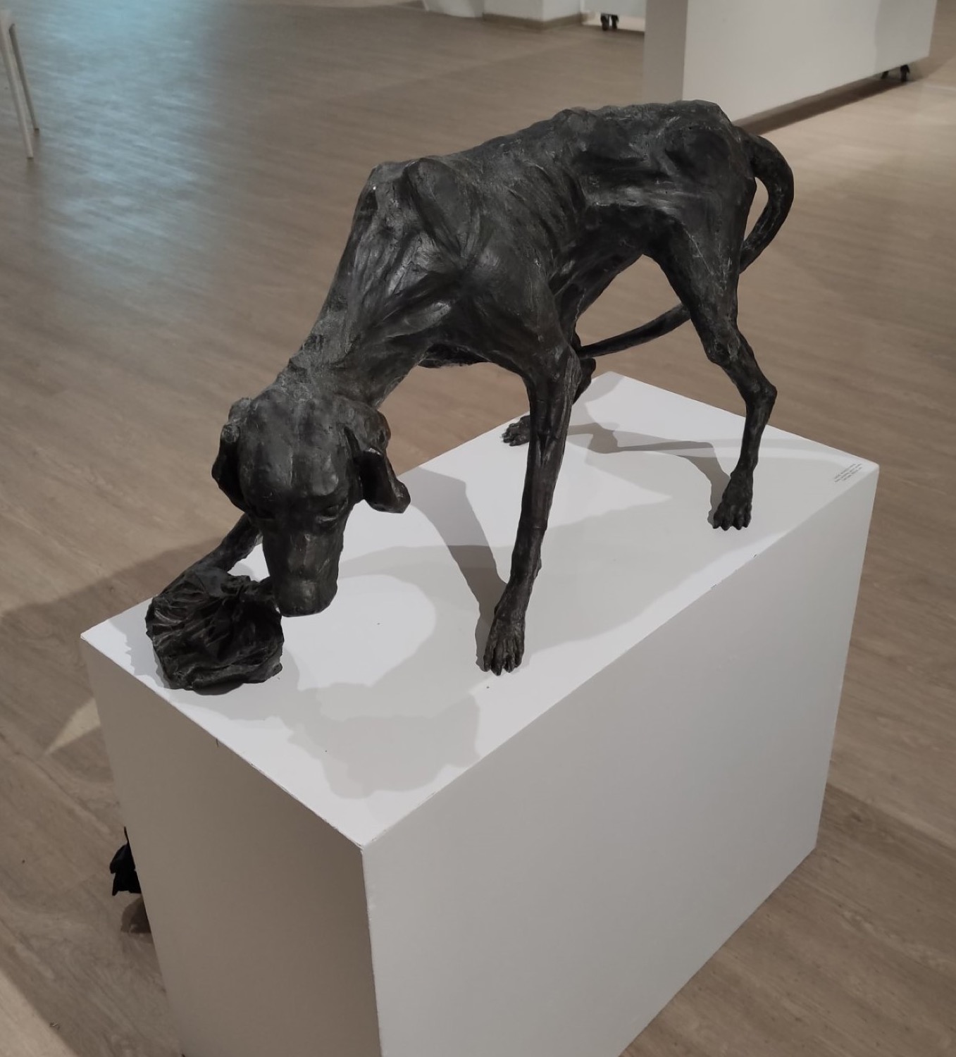 Στην έκθεση, στην οποία συμμετέχουν οι Σάκης Γκουντρουμπής, Νάντια Καλάρα, Νίκος Κόκκαλης, Τριαντάφυλλος Τρανός, Ράνια Φραγκουλίδου, Γιάννης Χρηστάκος και Έλλη Χρηστίδου, υποδέχθηκε τα μέλη και τους φίλους του Συλλόγου Φίλοι του Διαχρονικού Μουσείου Λάρισας η Ελένη Αναστασιάδου, ενώ την ενημέρωση στην περιήγηση των εκθεμάτων πραγματοποίησε ο Τριαντάφυλλος Τρανός. Ο Σάκης Γκουντρουμπής από την πλευρά του έκανε σύντομη παρουσίαση με εικόνες της παγκόσμιας πορείας των εικαστικών τεχνών και παραστατικάέδειξε την πολύ ενδιαφέρουσα εργασία του με την σχεδίαση, την δημιουργία προπλάσματος και τελικά την χύτευση του ορειχάλκινου έργου άσιτου σκύλου.