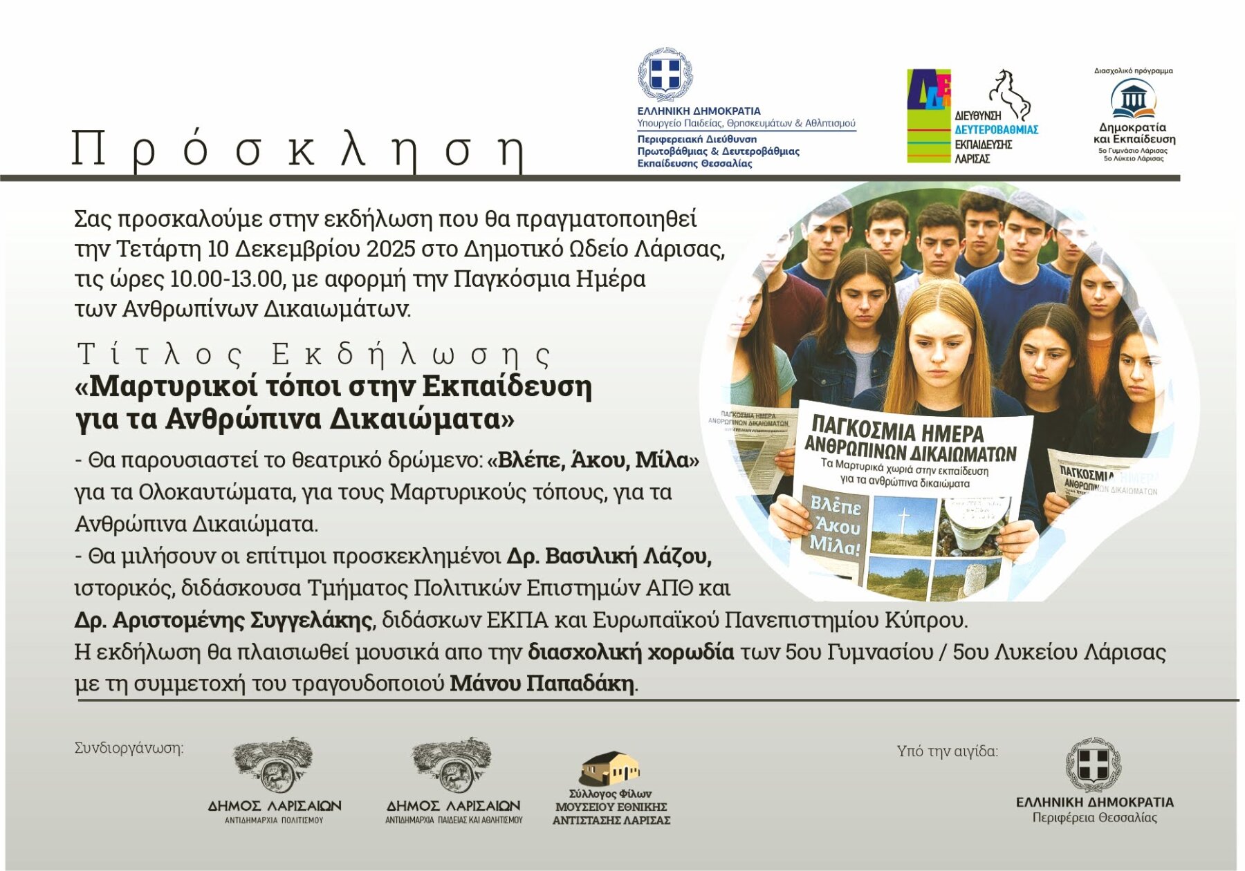 Με αφορμή την Παγκόσμια Ημέρα Ανθρωπίνων Δικαιωμάτων, την Τετάρτη 10 Δεκεμβρίου 2025, μαθητές, εκπαιδευτικοί, μουσικοί και πανεπιστημιακοί συναντώνται στο Δημοτικό Ωδείο Λάρισας (ώρες 10:00–13:00) στην εκδήλωση με τίτλο «Μαρτυρικοί τόποι στην Εκπαίδευση για τα Ανθρώπινα Δικαιώματα».