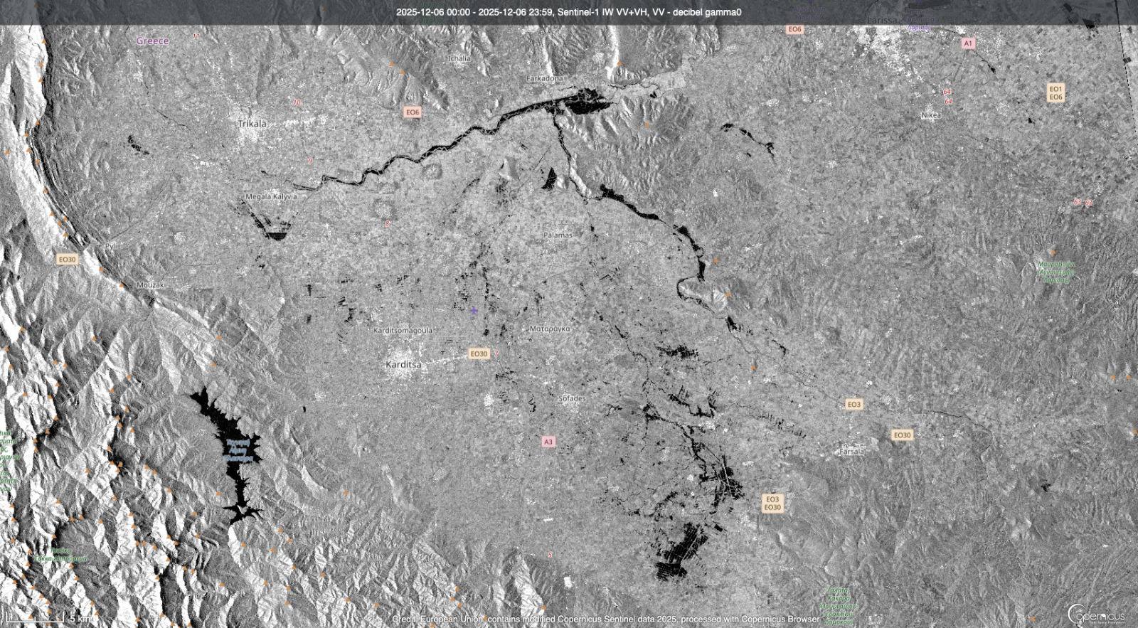 “Η κακοκαιρία Byron σε νούμερα. Η Θεσσαλία δέχθηκε το 33% του νερού του Ντάνιελ. Ο αστικός Βόλος το 66% του νερού του elias. Όπως βλέπετε στην ασπρόμαυρη φωτογραφία από δορυφόρο τα μαύρα είναι τα ποτάμια και τα χωράφια που πλημμύρισαν χθες. Κάτω η πλημμυρικη περιοχή μετά τον Ιανό. Ο ιανος είχε περίπου 23% πάνω από τον Byron.