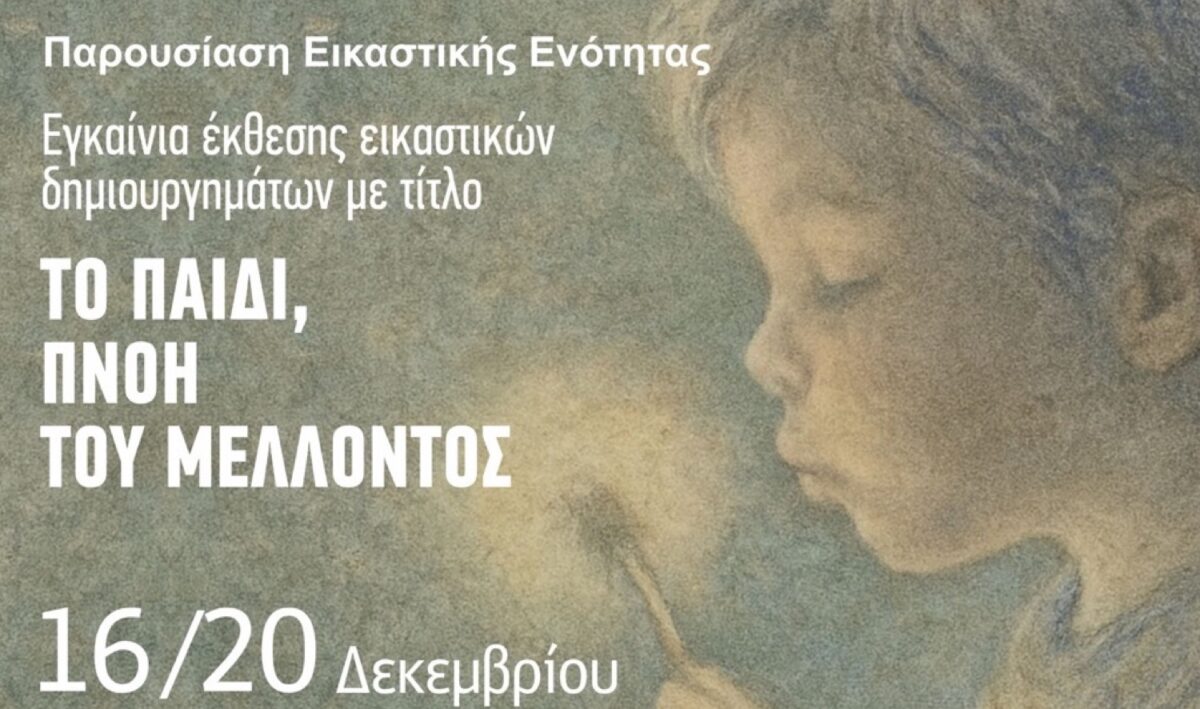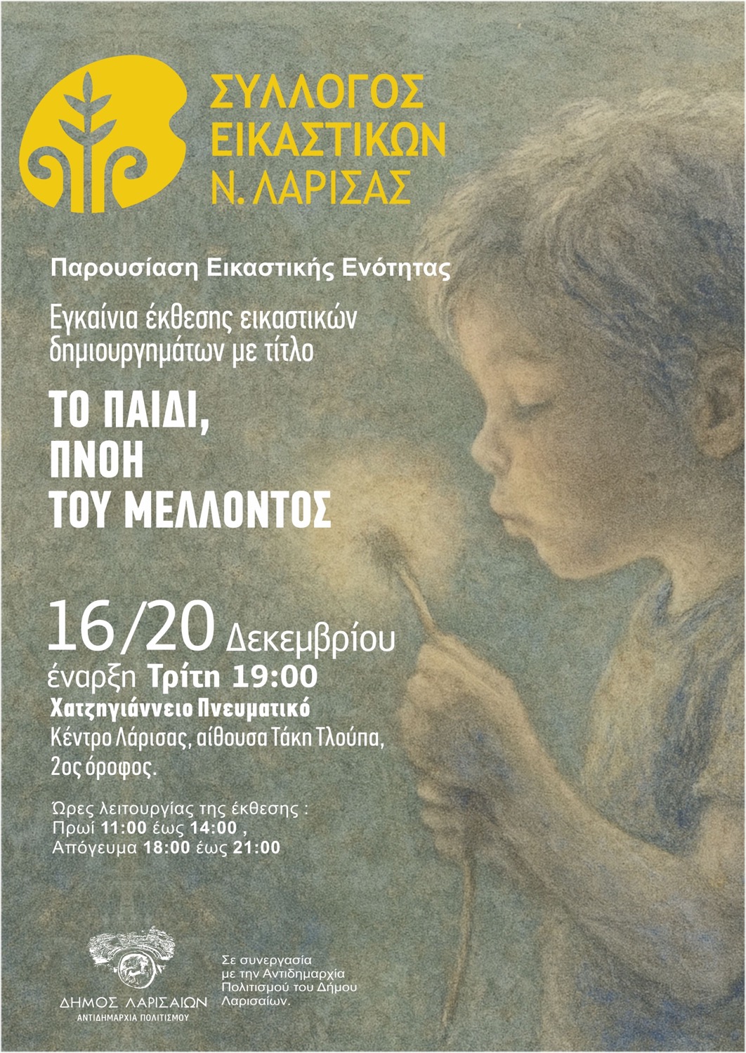 Έκθεση εικαστικών δημιουργημάτων με τίτλο “ΠΑΙΔΙ, ΠΝΟΗ ΤΟΥ ΜΕΛΛΟΝΤΟΣ”, διοργανώνουν ο Σύλλογος Εικαστικών Ν. Λάρισας, σε συνεργασία με την Αντιδημαρχία Πολιτισμού του Δήμου Λαρισαίων. Τα εγκαίνια της έκθεσης θα πραγματοποιηθούν την Τρίτη 16 Δεκεμβρίου 2025 στις 19:00, στο Χατζηγιάννειο Πνευματικό Κέντρο Λάρισας, (αίθουσα Τάκη Τλούπα, 2ος όροφος). Η είσοδος είναι ελεύθερη.