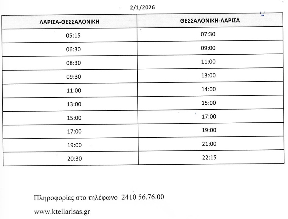 Το Υπεραστικό Κ.Τ.Ε.Λ. Λάρισας έδωσε στη δημοσιότητα τα δρομολόγια Αθηνών και Θεσσαλονίκης για τα Χριστούγεννα και την Πρωτοχρονιά τα οποία και διαμορφώνονται ως εξής :