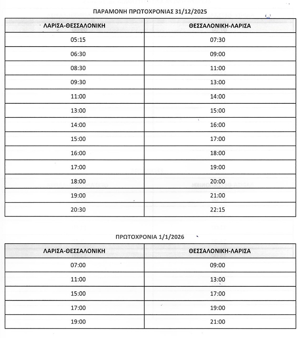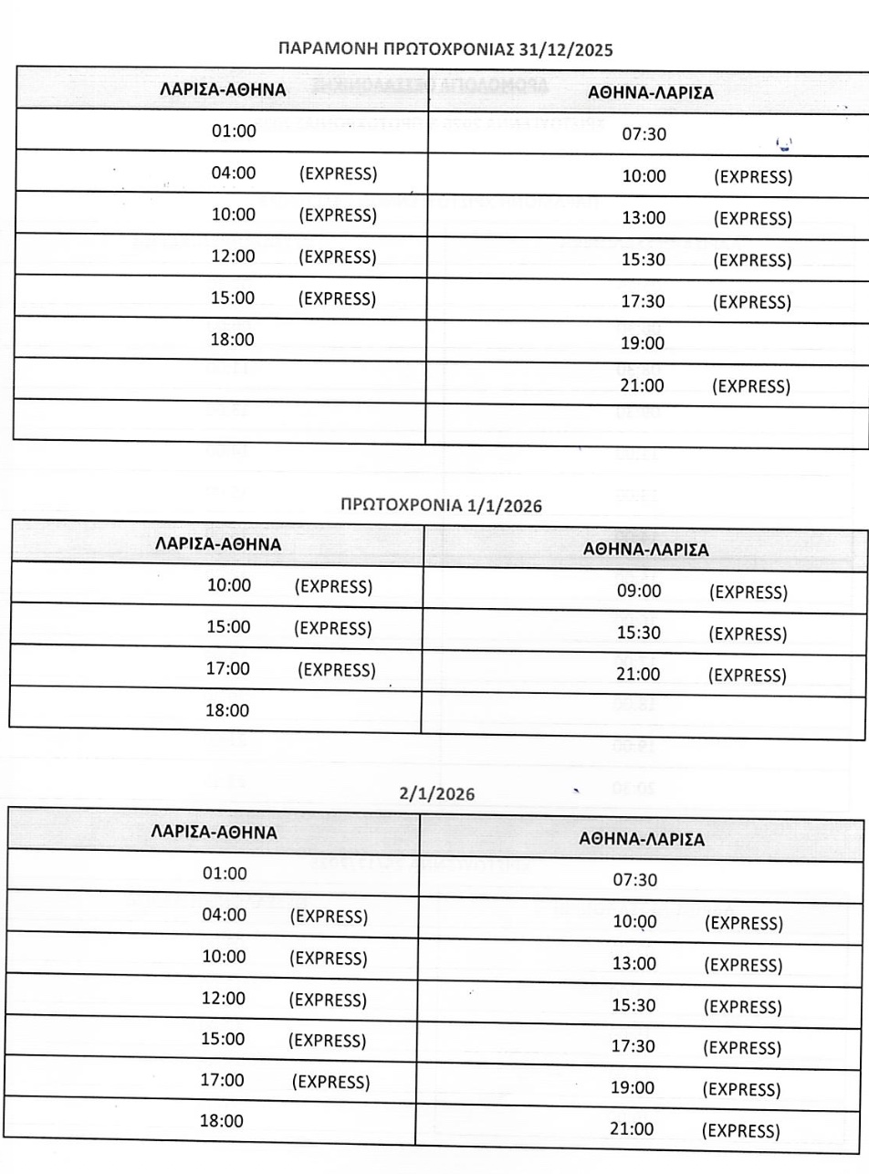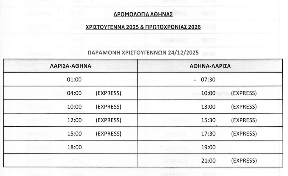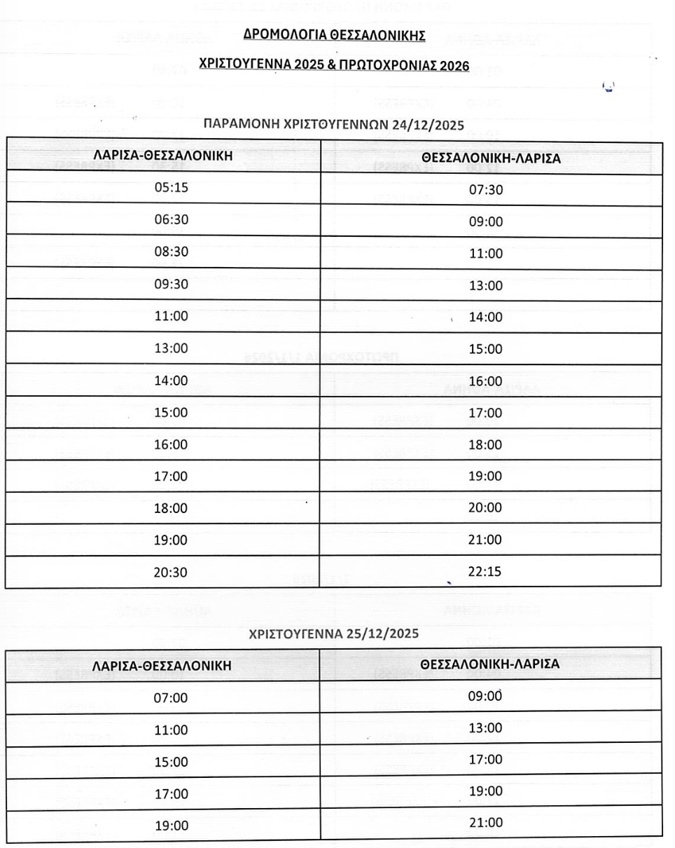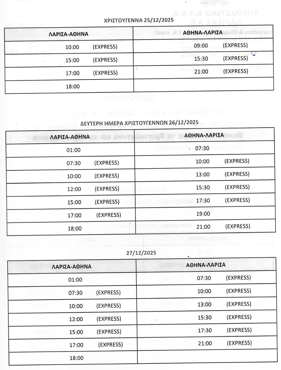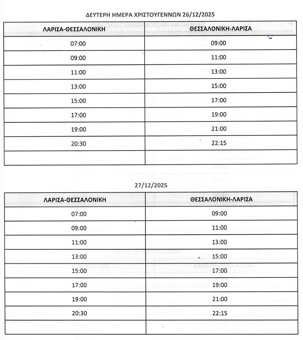 Το Υπεραστικό Κ.Τ.Ε.Λ. Λάρισας έδωσε στη δημοσιότητα τα δρομολόγια Αθηνών και Θεσσαλονίκης για τα Χριστούγεννα και την Πρωτοχρονιά τα οποία και διαμορφώνονται ως εξής :