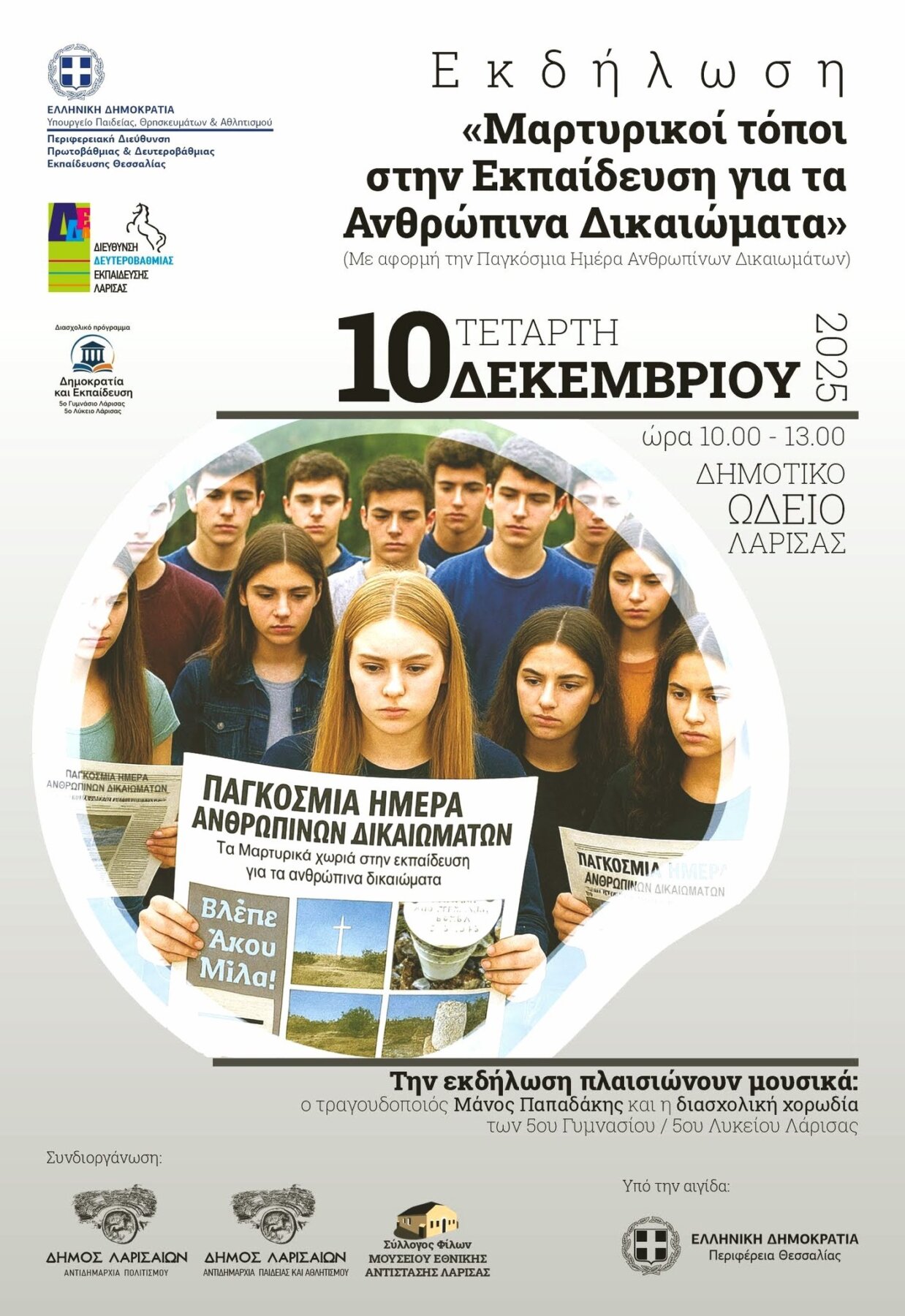 Με αφορμή την Παγκόσμια Ημέρα Ανθρωπίνων Δικαιωμάτων, την Τετάρτη 10 Δεκεμβρίου 2025, μαθητές, εκπαιδευτικοί, μουσικοί και πανεπιστημιακοί συναντώνται στο Δημοτικό Ωδείο Λάρισας (ώρες 10:00–13:00) στην εκδήλωση με τίτλο «Μαρτυρικοί τόποι στην Εκπαίδευση για τα Ανθρώπινα Δικαιώματα».