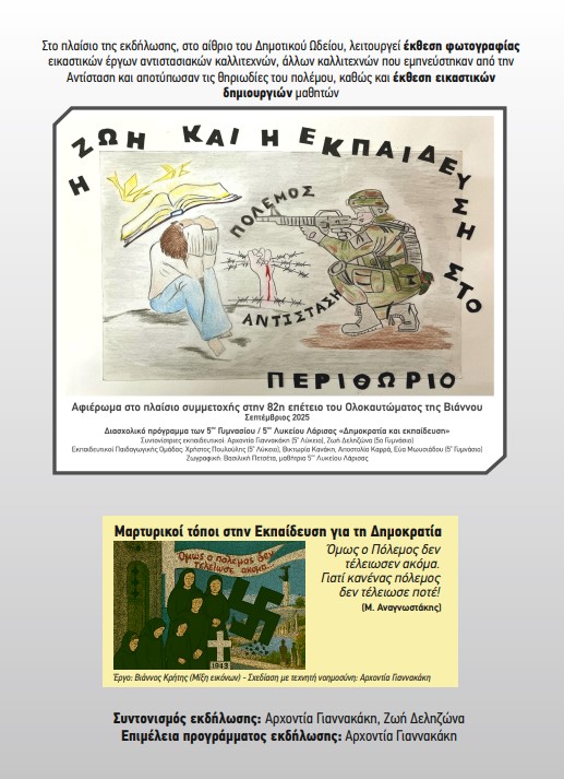 Την εκδήλωση θα πλαισιώσει η διασχολική χορωδία 5ου Γυμνασίου / 5ου Λυκείου Λάρισας, υπό την καθοδήγηση της εκπαιδευτικού Εύας Μωυσιάδου και με τη μουσική διδασκαλία του εκπαιδευτικού Χρήστου Πουλούλη. Συμμετέχει ο τραγουδοποιός Μάνος Παπαδάκης, ο οποίος συνεργάστηκε με τη χορωδία στη συναυλία της 15ης Σεπτεμβρίου 2025 στο Κηποθέατρο «Νίκος Καζαντζάκης» του Ηρακλείου Κρήτης, για τα 82 χρόνια από το Ολοκαύτωμα της Βιάννου.