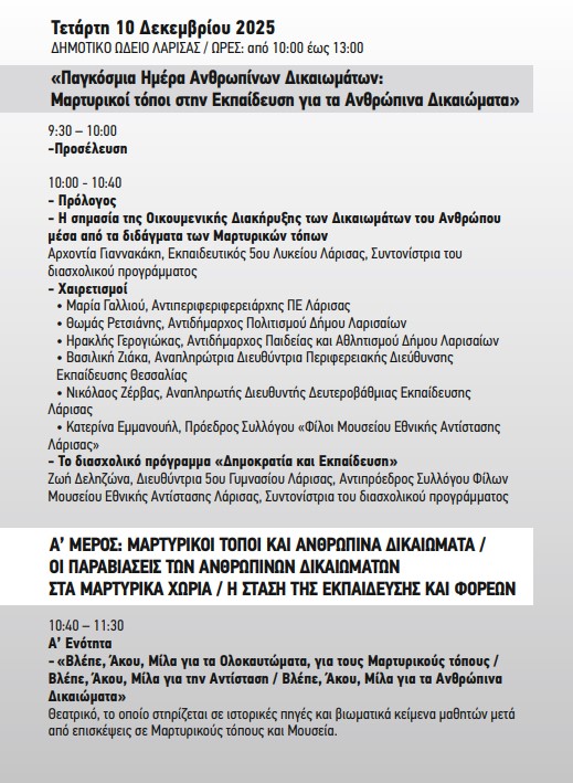 Με αφορμή την Παγκόσμια Ημέρα Ανθρωπίνων Δικαιωμάτων, την Τετάρτη 10 Δεκεμβρίου 2025, μαθητές, εκπαιδευτικοί, μουσικοί και πανεπιστημιακοί συναντώνται στο Δημοτικό Ωδείο Λάρισας (ώρες 10:00–13:00) στην εκδήλωση με τίτλο «Μαρτυρικοί τόποι στην Εκπαίδευση για τα Ανθρώπινα Δικαιώματα».
