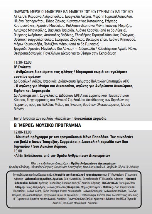 «Μαρτυρικοί τόποι στην Εκπαίδευση για τα Ανθρώπινα Δικαιώματα»: Μαθητές και Εκπαιδευτικοί της Λάρισας, Μουσικοί και Πανεπιστημιακοί, ενώνουν τις φωνές τους για τα Ανθρώπινα Δικαιώματα