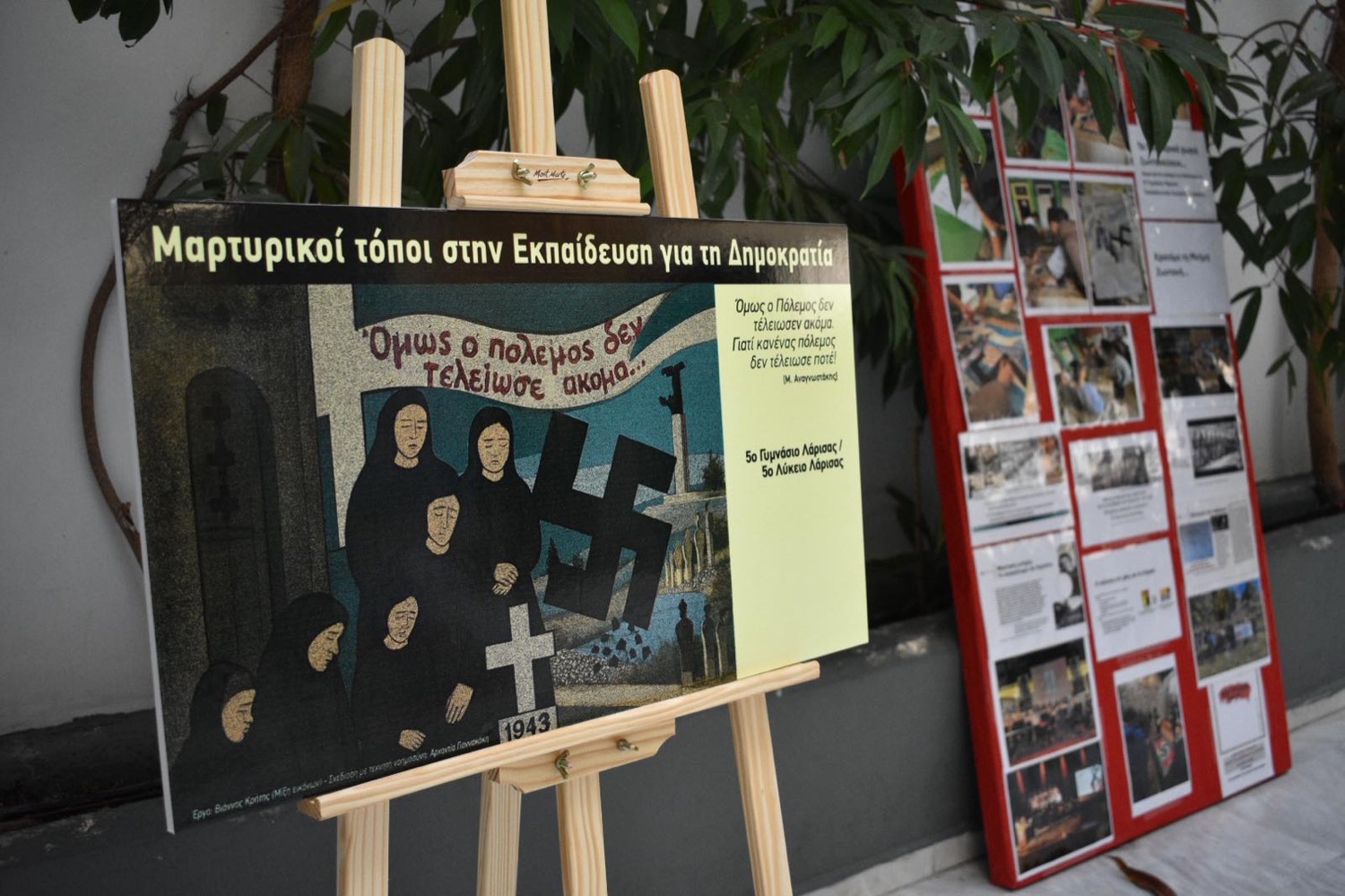 Παράλληλα, στο αίθριο λειτούργησε έκθεση φωτογραφίας και εικαστικών έργων σχετικών με την Αντίσταση και το Ολοκαύτωμα των χωριών, καθώς και δημιουργίες μαθητών, προσφέροντας μια συνολική βιωματική εμπειρία που υπογράμμισε τη σημασία της δημοκρατίας, της ειρήνης και της πρόληψης κάθε μορφής βίας και διακρίσεων.
