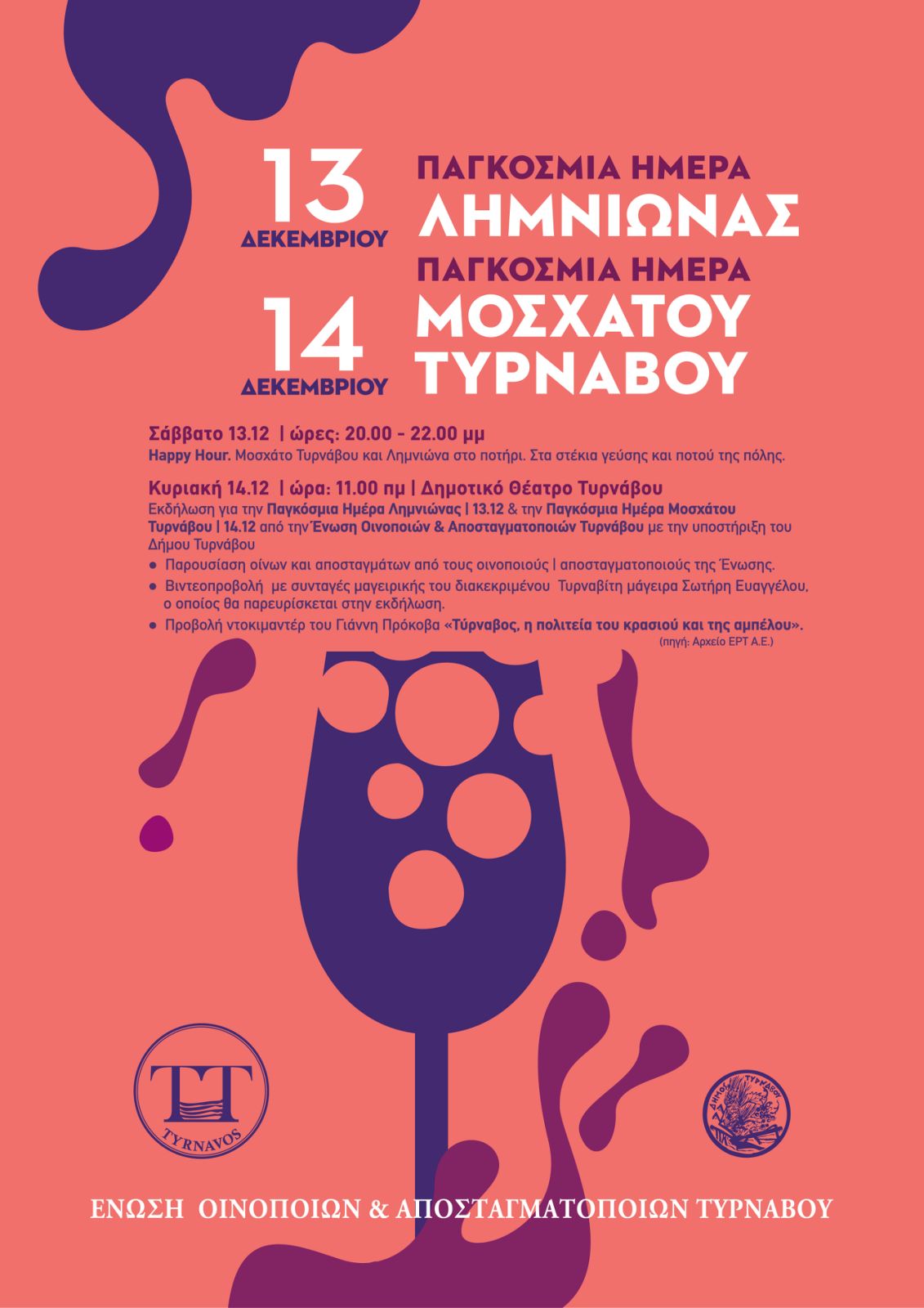 Με την Παγκόσμια Ημέρα Λημνιώνας στις 13 Δεκεμβρίου και την Παγκόσμια Ημέρα Μοσχάτου Τυρνάβου στις 14 Δεκεμβρίου, ο θεσμός που εγκαινιάστηκε πέρυσι αποκτά πλέον ακόμη μεγαλύτερη δυναμική, με τη φετινή διοργάνωση να περιλαμβάνει στοχευμένες δράσεις, συμμετοχή των οινοποιείων και αποσταγματοποιείων του Τυρνάβου και εκδηλώσεις που αναδεικνύουν συνολικά το οινικό και γαστρονομικό αποτύπωμα της περιοχής.